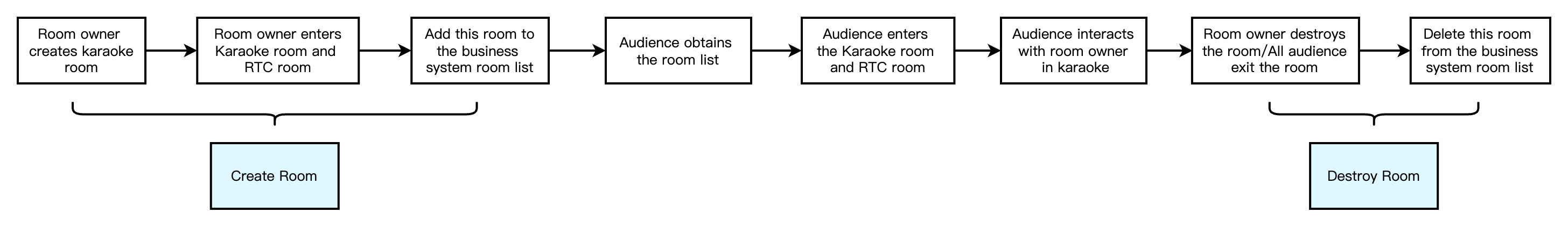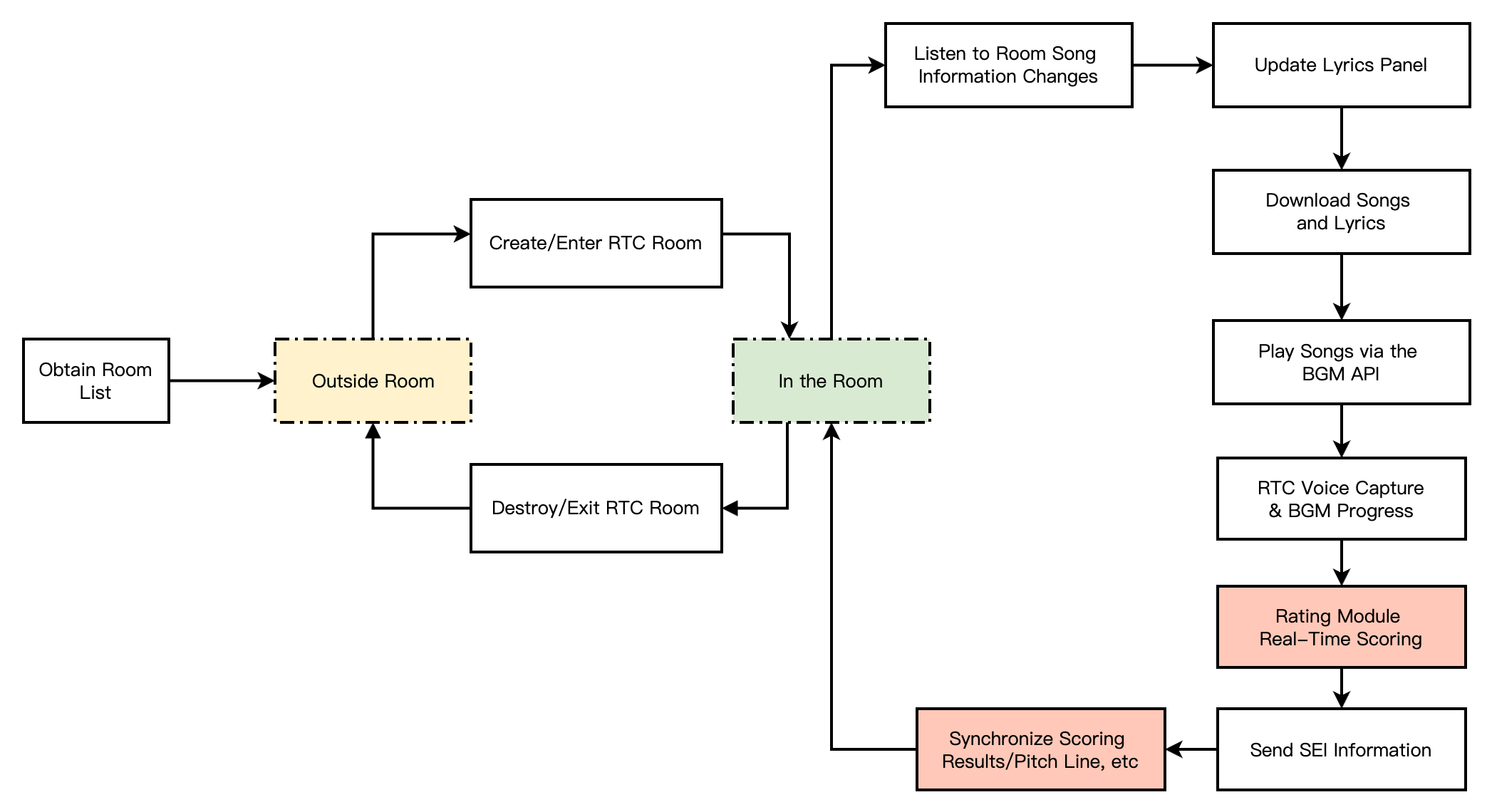 The overall business process of the online Karaoke scenario is shown in the following diagram. The room owner creates a Karaoke room, and users can choose the Karaoke room they are interested in to enter. After entering the room, users can request to speak to participate in the interaction. After becoming a speaker, they can also choose their favorite songs to sing and wait in line. When it is their turn, they can sing along with the accompaniment. Of course, users can also choose to become a speaker directly to participate in a chorus. These are two different Karaoke play modes. During the singing process, there will be pitch scoring for individual sentences, and there will also be singing scoring for the entire song after the singing is finished.