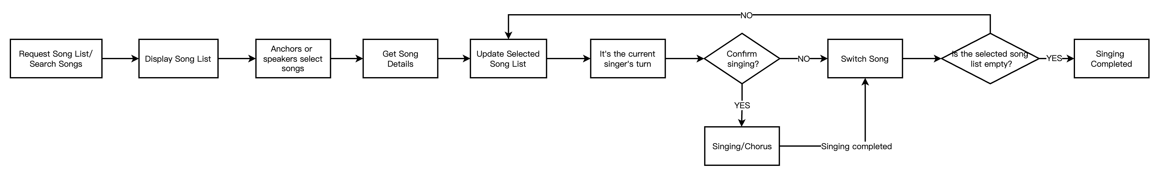Solo singing: Primarily in the interactive Karaoke scenario with multiple participants, after the anchor/audience members become speakers, they can proceed to select songs. Once a song selection is successful, it will be displayed collectively on the song selection platform. When it's someone's turn to select a song, the corresponding individual will play the song's accompaniment, start singing, and undergo scoring.