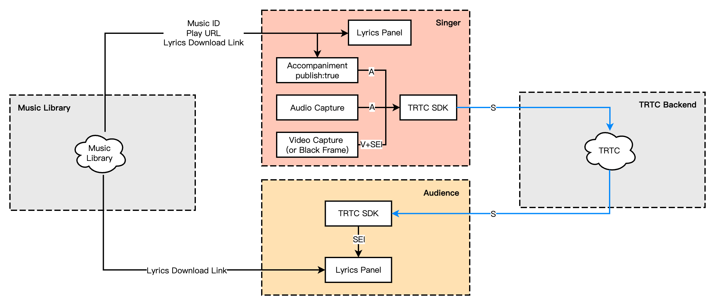 The overall solution primarily relies on the music library for song and lyric resources and TRTC for streaming the singer's vocals, song accompaniment, and streaming. The solution architecture is as follows: