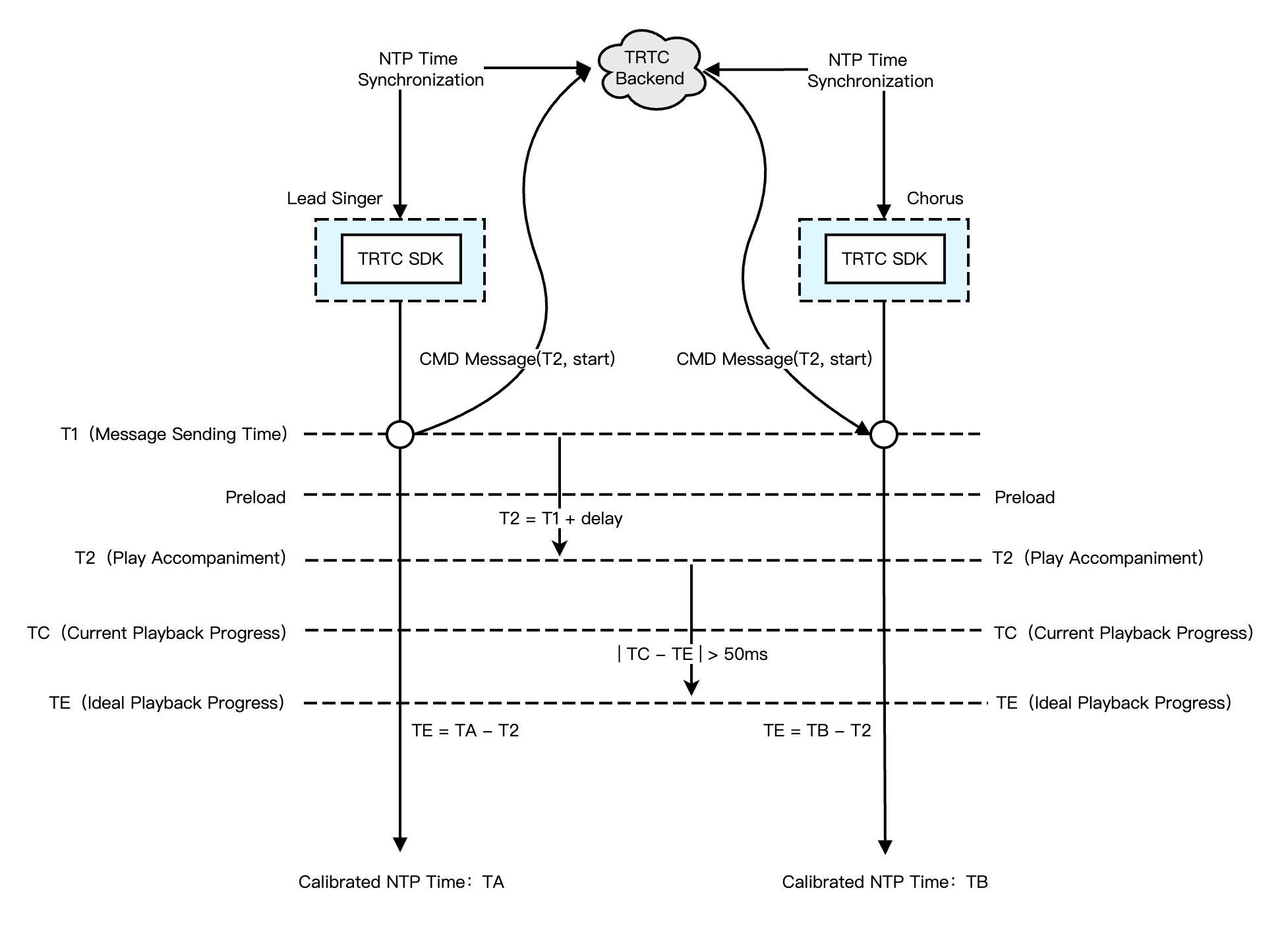 In real-time scenarios, it is necessary to synchronize the accompaniment progress in real-time after starting the performance to avoid increasing end-to-end latency due to accompaniment errors. Synchronizing the accompaniment requires NTP time-based synchronization because the local clocks of different devices are not consistent, resulting in some errors. Therefore, Tencent Cloud's self-developed NTP service is introduced. Additionally, users who join the ensemble midway also need to synchronize the accompaniment progress. Only after synchronizing the progress can they join in the chorus.