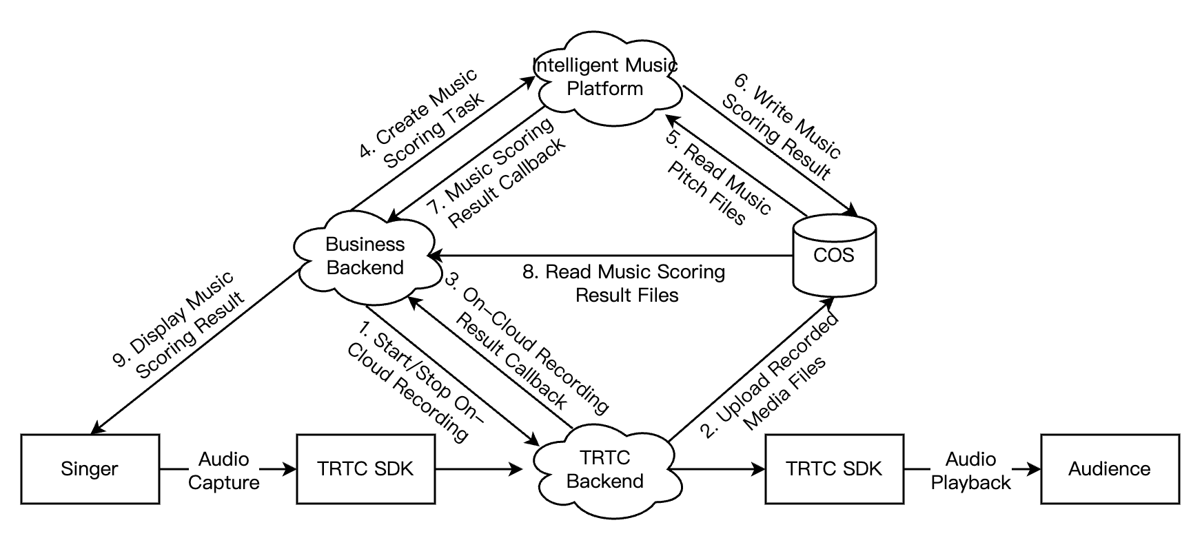 The accompaniment scoring feature is an indispensable feature in the Online Karaoke scenario. You need to access the standardized audio file and MIDI pitch file of the music resources in advance, and then it is recommended to use the music scoring feature of the Intelligent Music Platform to score the singer's voice from TRTC on-cloud recording. The overall process of the Music Scoring Integration Solution is shown in the following diagram. 2. The TRTC backend will upload the recorded singing clip media file to the COS bucket specified when initiating the recording task. 5. The Intelligent Music Platform reads the singing clip and the standard pitch file from the COS bucket for scoring.