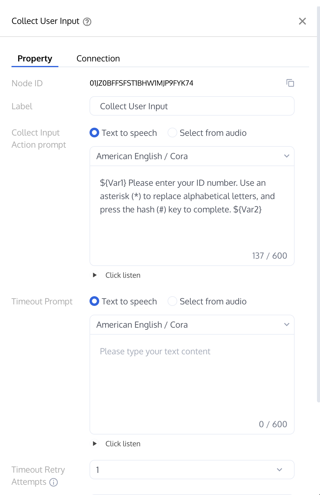 Collect Input Action module uses voice announcements to guide users to input information through keys (DTMF). The user's input information will be stored in the set variable name.