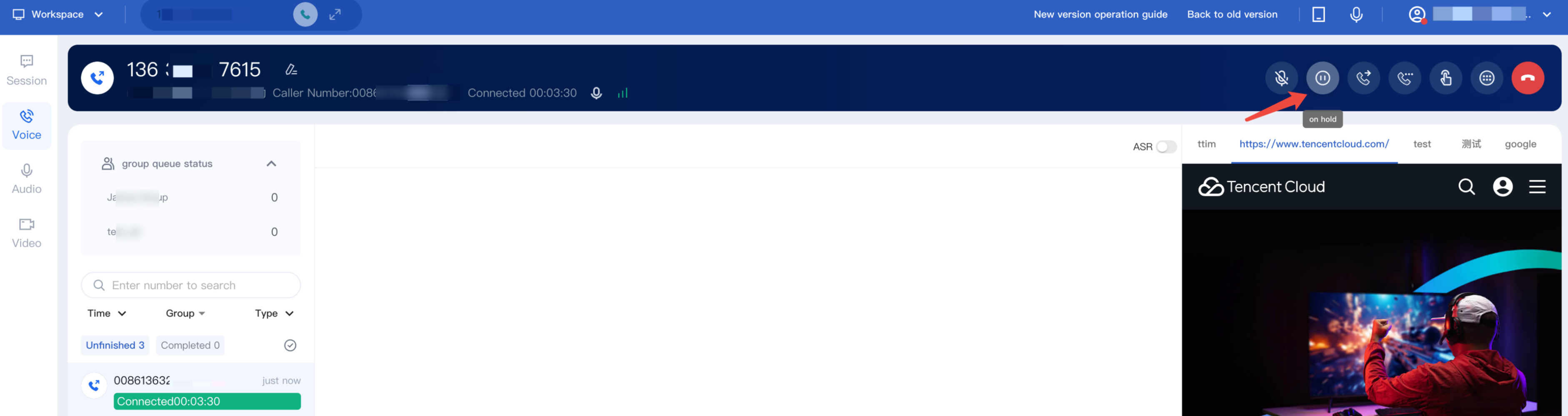 During a call, staff can click On Hold in Voice module to play the default on-hold prompt. To resume, click Cancel Hold. While on hold, staff can still hear the user.