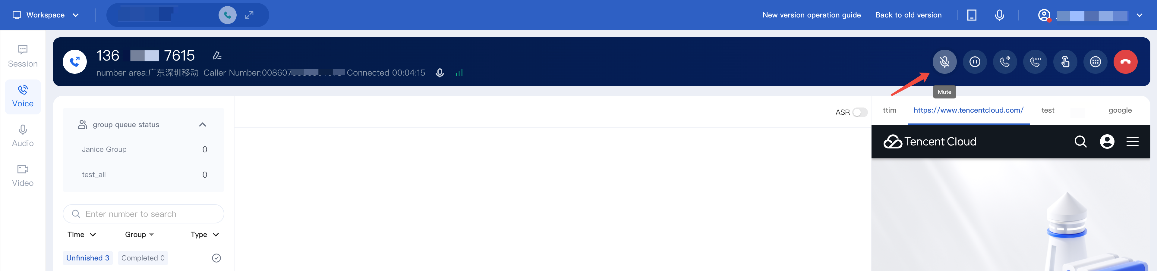During a call, staff can click Mute in the Voice module to Mute their audio while still hearing the user. Click Unmute to resume talking.