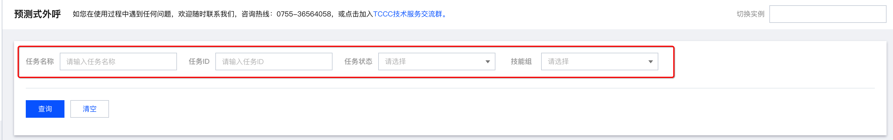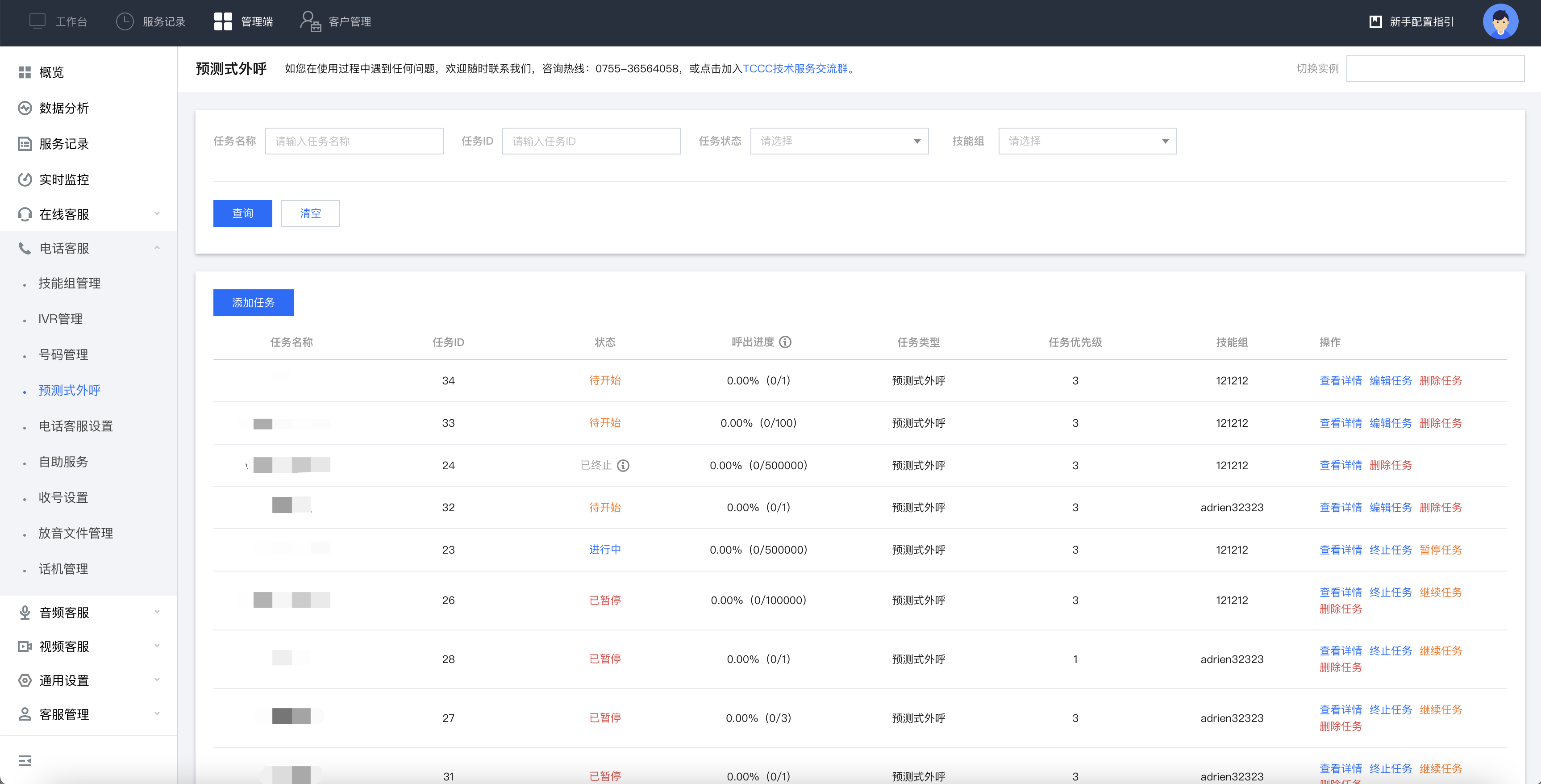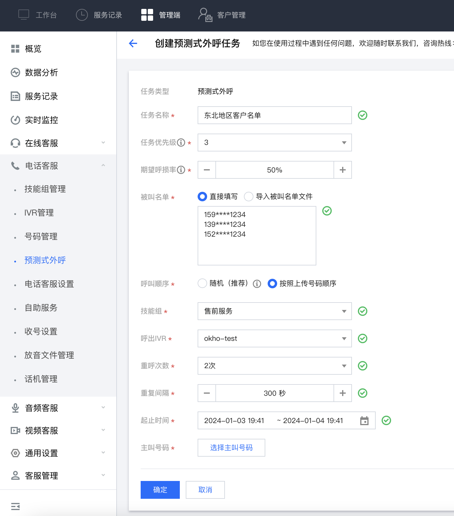 4 | 被叫客户名单 | 支持直接输入或者导入客户名单文件两种方式,导入文件只支持上传 .xlsx文件,名单中应只包含客户电话号码列表,号码之间用换行符分割 |