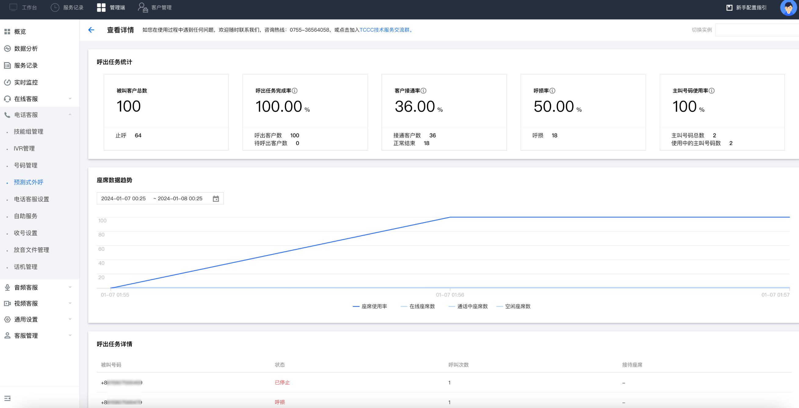呼出任务完成率 = 呼出客户数 / 被叫客户总数客户接通率 = 呼出接通客户数 / 被叫客户总数,其中呼出接通客户数包含正常结束与呼损的客户数呼损率 = 呼损数 / 接通客户数,即呼损率 = 呼损数 / 呼损数 + 呼出正常结束的客户数主叫号码使用率 = 使用中的主叫号码数 / 主叫号码总数文档反馈