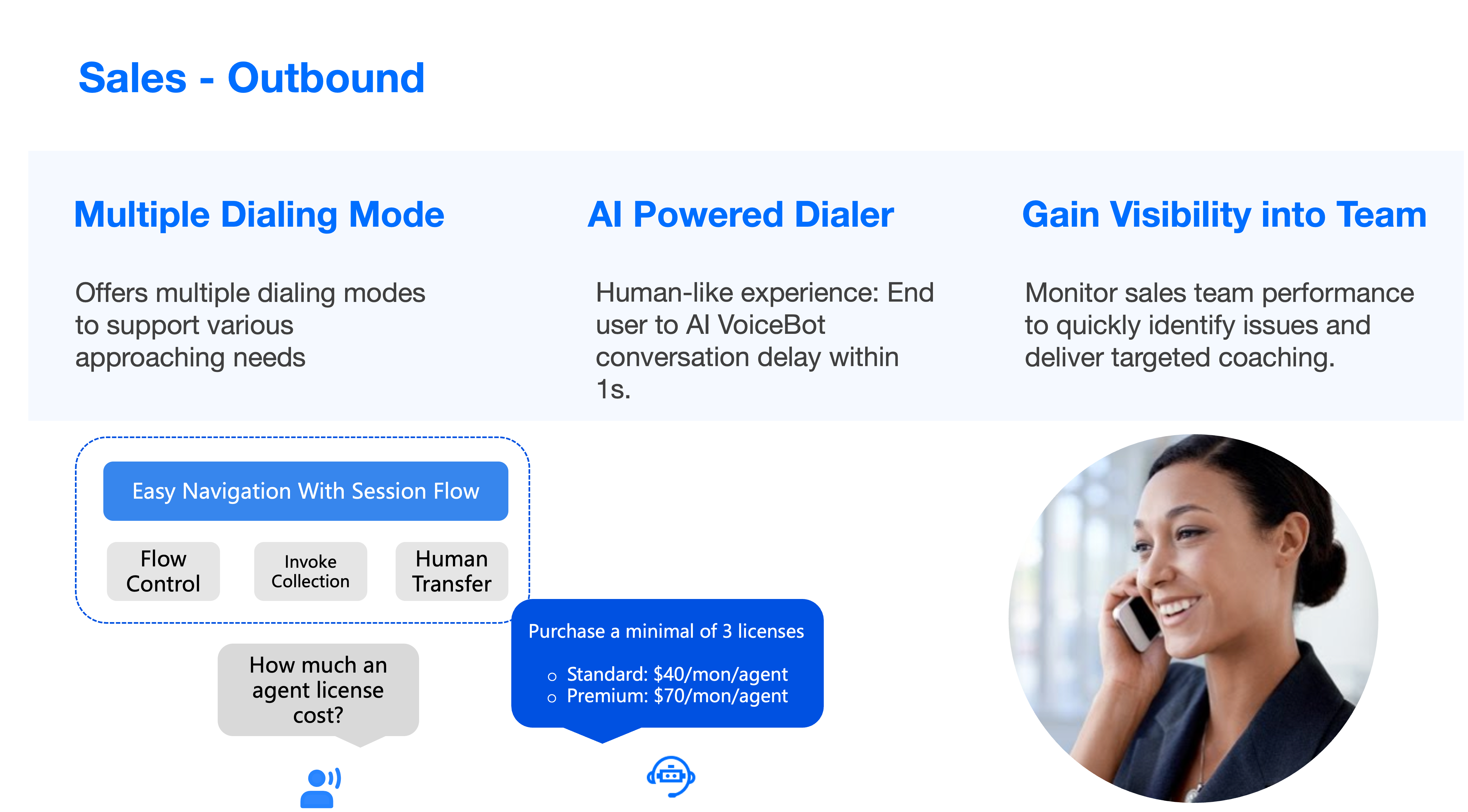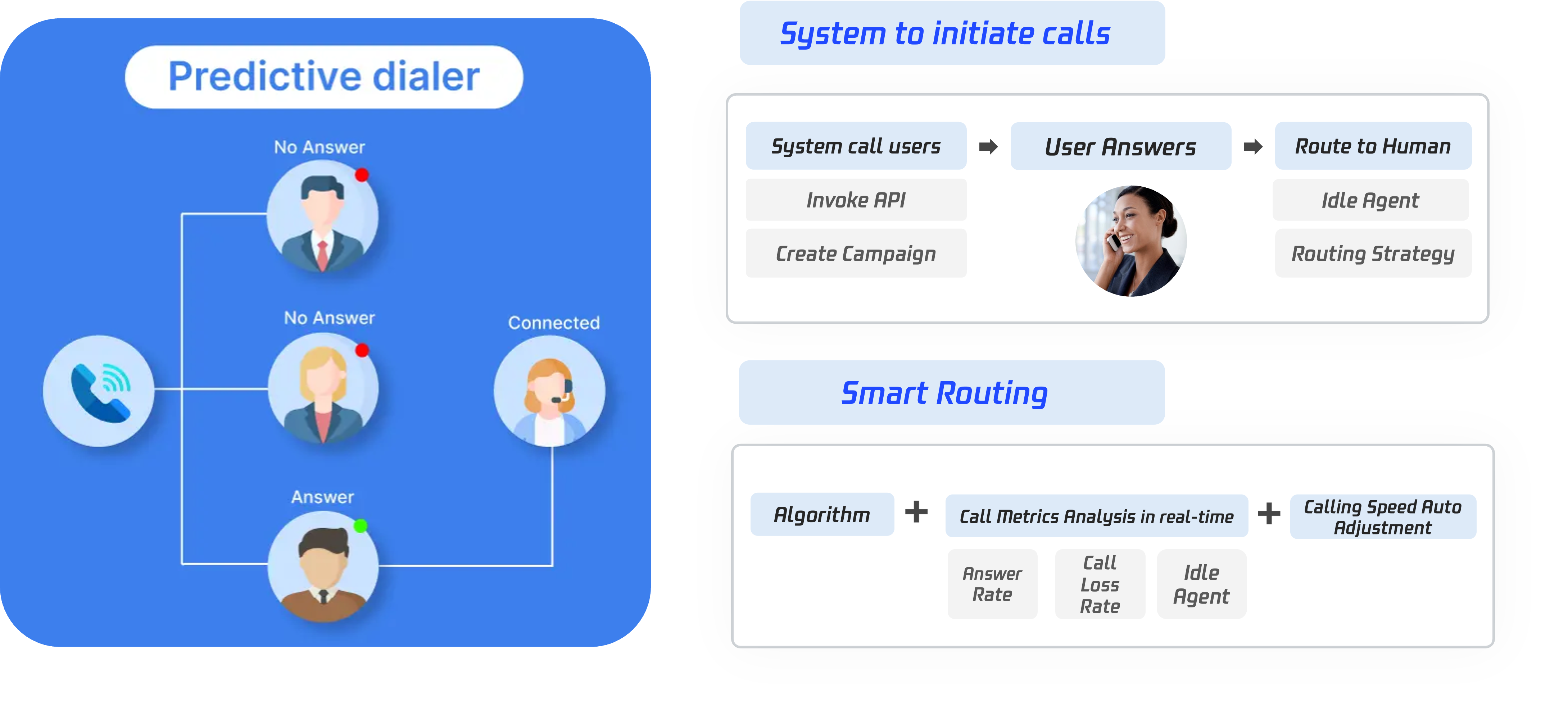 Predictive Dialing Predictive dialing leverages AI to analyze real-time data(e.g., connection rate and agent availability), automatically adjusting call speed to maximize labor efficiency. Pro: Maximize agent productivity and reduce labor cost , it initiates calls based on agent availability, ensuring seamless connections when customers answer.
