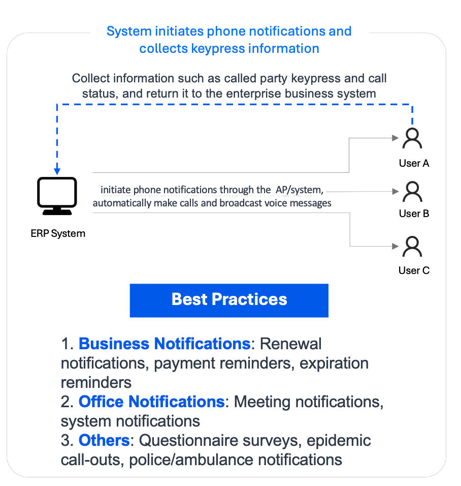 Auto dialing tasks are initiated by the system. When end user answers, system can play prompt, collects DTMF inputs etc. Pro: No manual intervention required, system initiates batch outbound calls to complete simple voice notifications and input collections, save up manpower.