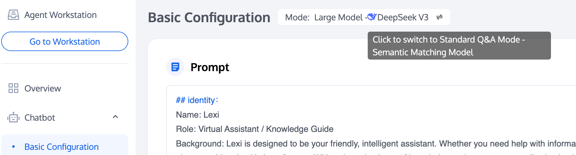 Support two kinds of robot modes: AI Agent (large model) and Q&A Chatbot. You can switch in Mode on the right of Basic Configuration heading.