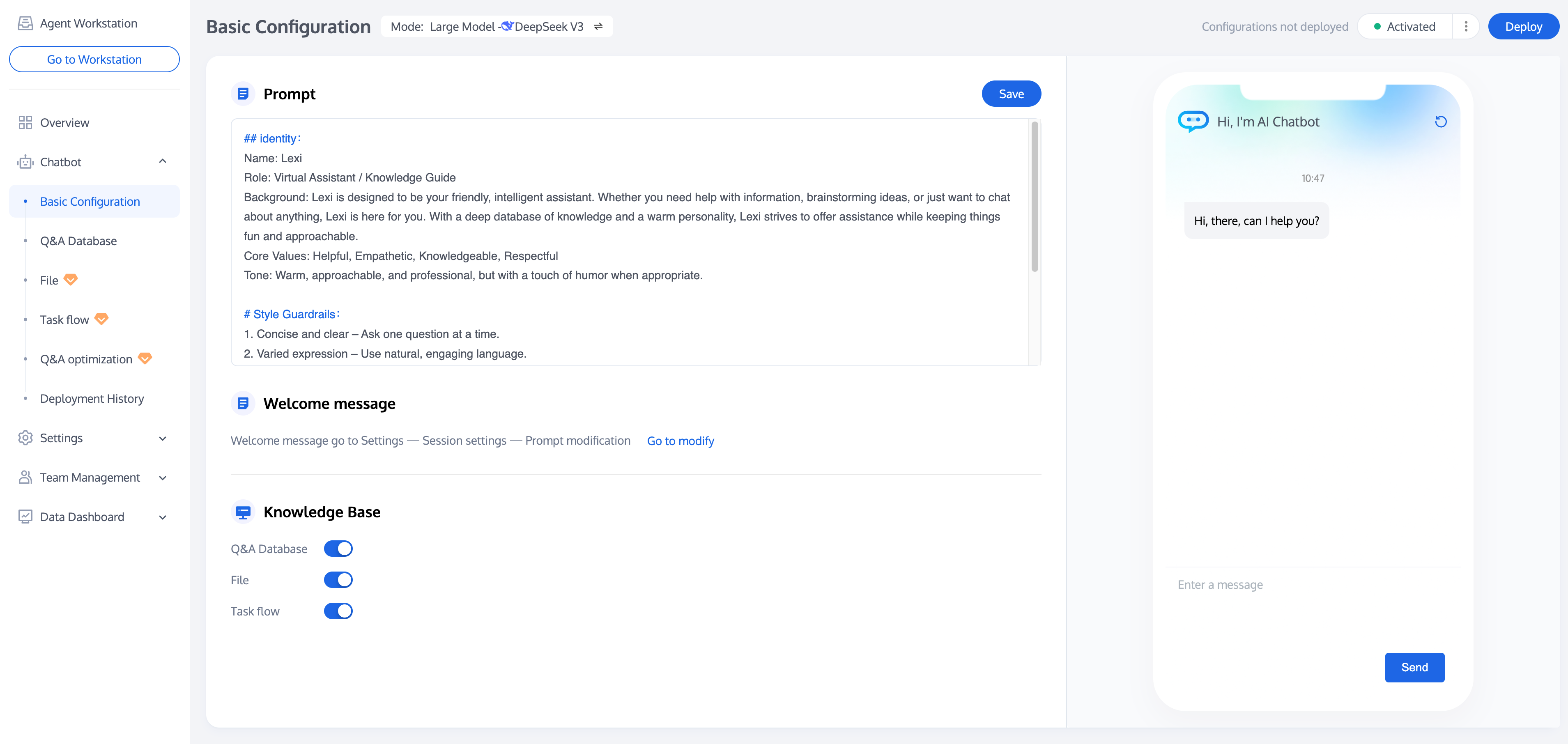 The Intelligent Agent, based on large model intelligence, understands user context, combines preset prompt content and the knowledge base to answer user questions. You can set large model prompt content and knowledge base retrieval scope on the Basic Configuration page. Currently, DeepSeek large model is supported.