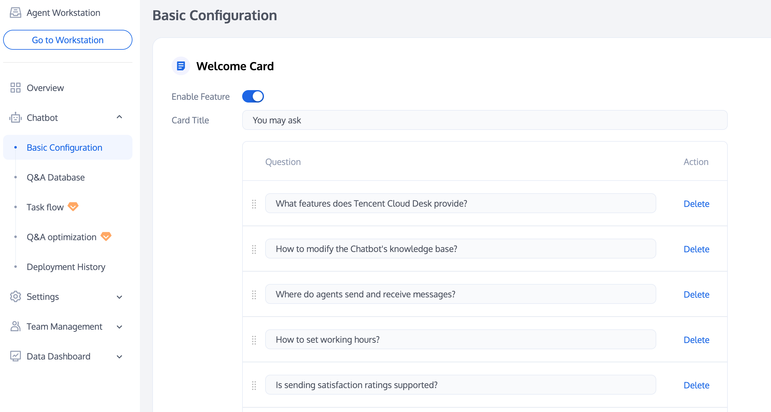 Sort the questions on the welcome card using the sort button on the left side of the question. The Chatbot will prioritize displaying the questions positioned towards the front by default.