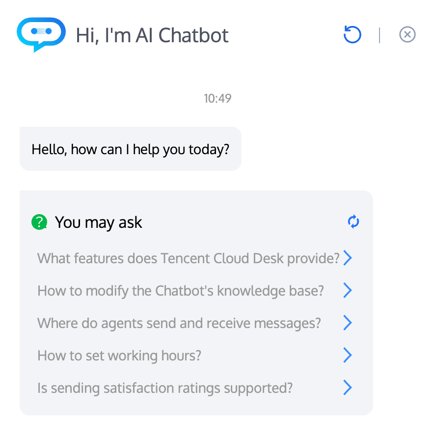 After entering the conversation, the Chatbot will automatically push the configured questions in the form of a card, which can be used to display high-frequency common issues.
