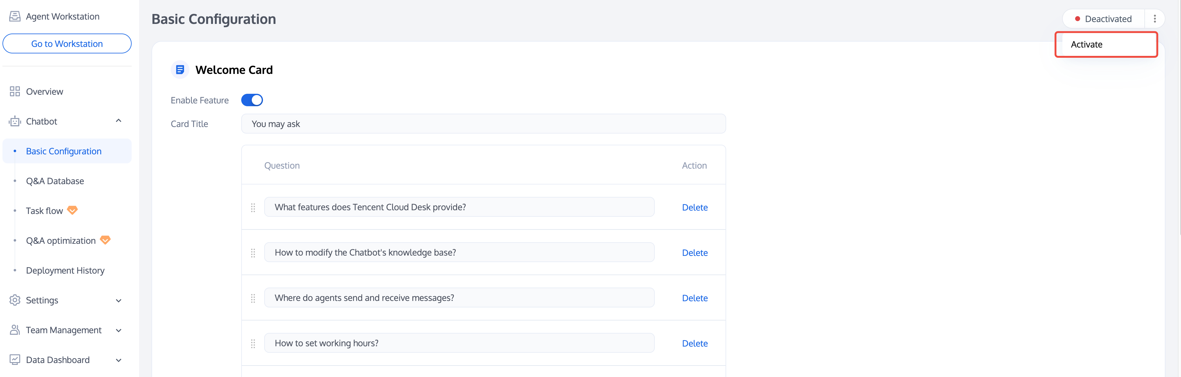 If you need to enable the intelligent bot after disabling it, click Activate Chatbot in the upper right corner.