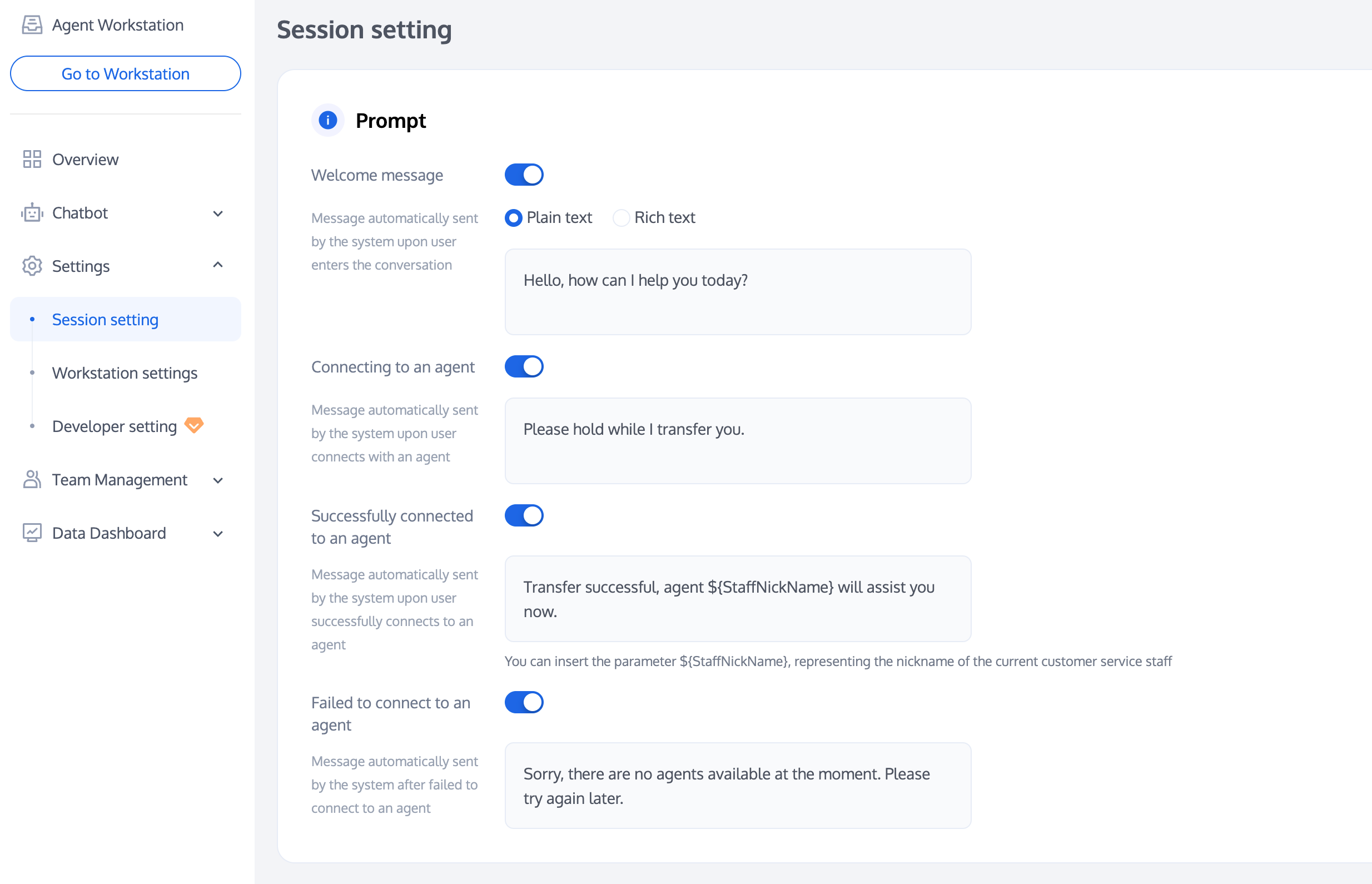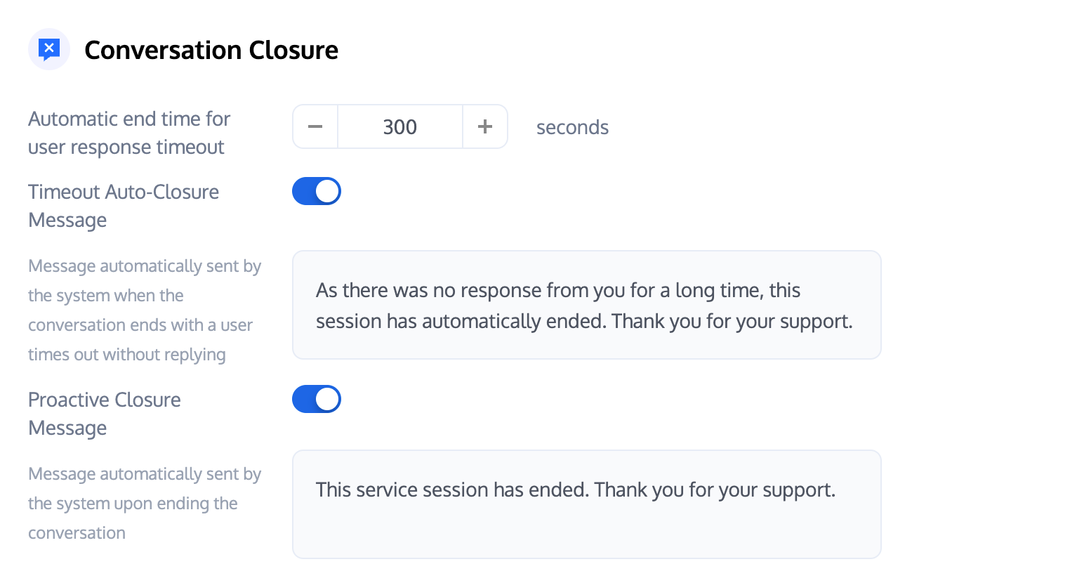Proactive Closure Message: After this feature is enabled, when the user or customer service actively ends the session, the preset prompt will be automatically sent to the user.