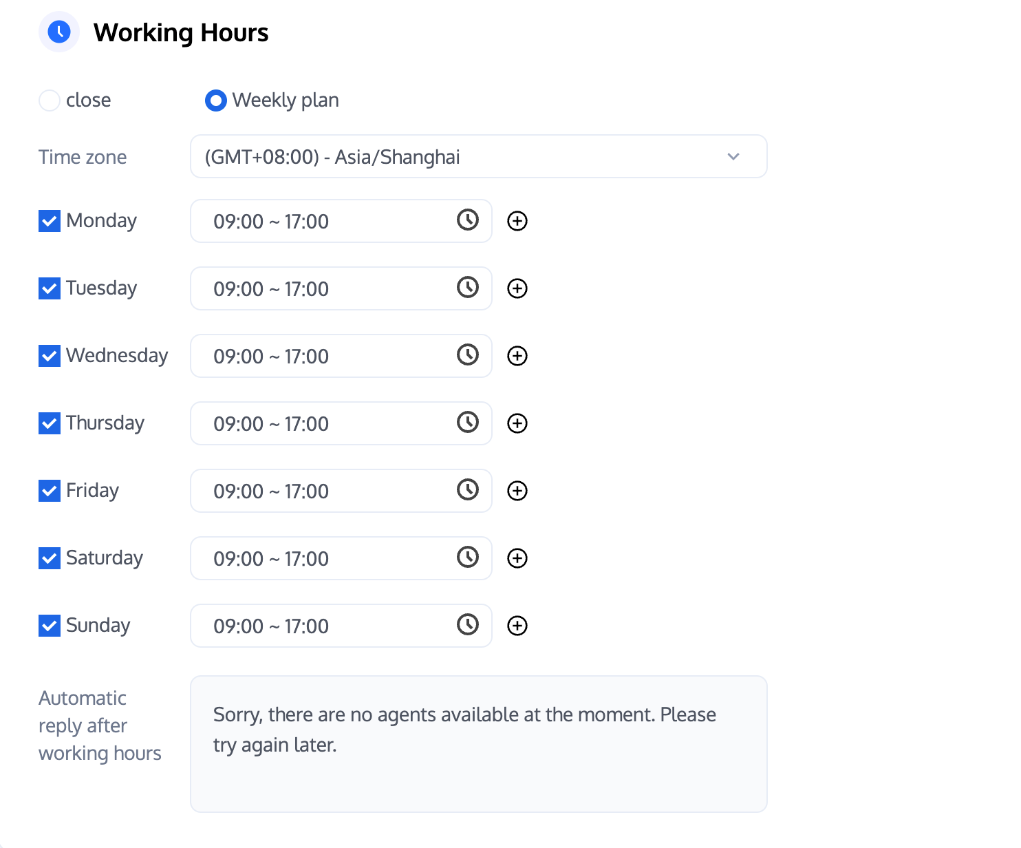 Smart customer service allows you to customize working hours for customer service personnel.