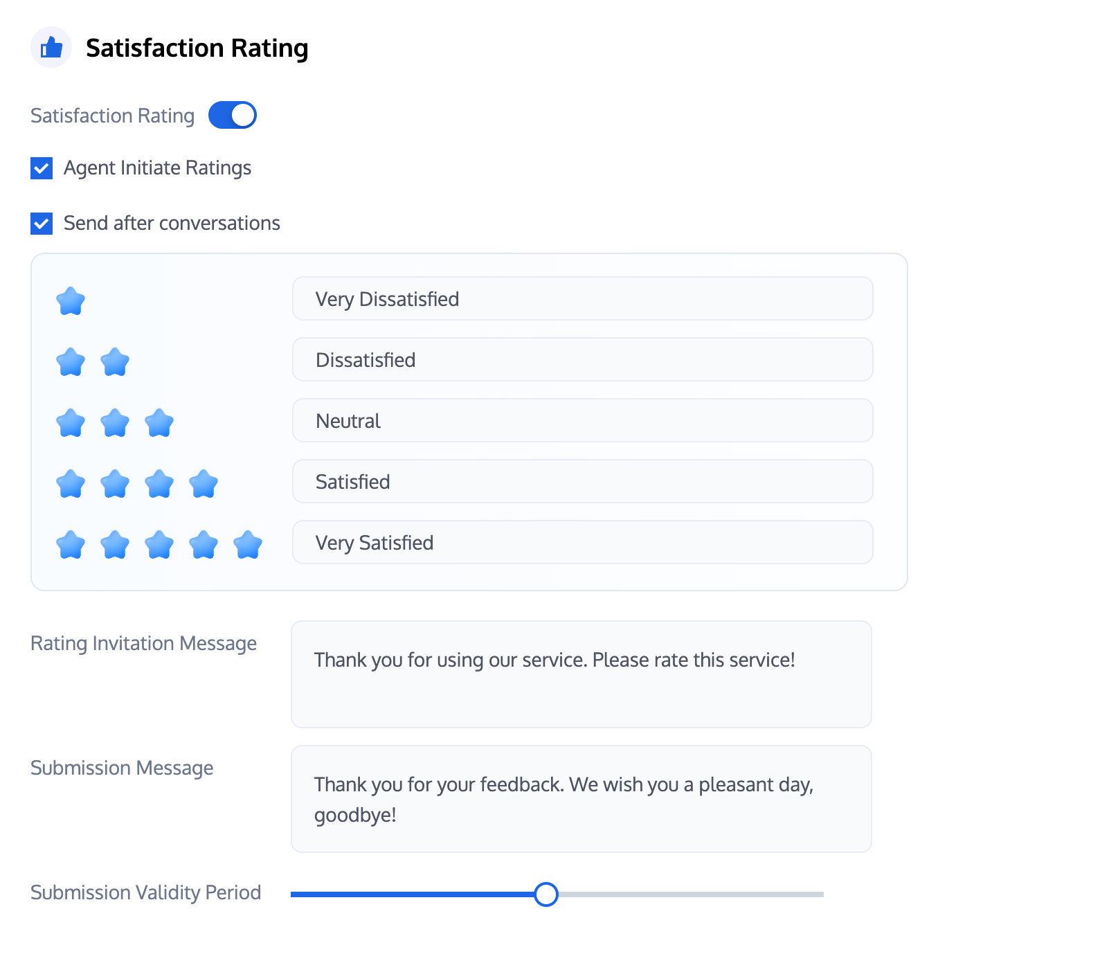 Agent Initiate Ratings: After this feature is enabled, customer service personnel can proactively invite users to leave a review.