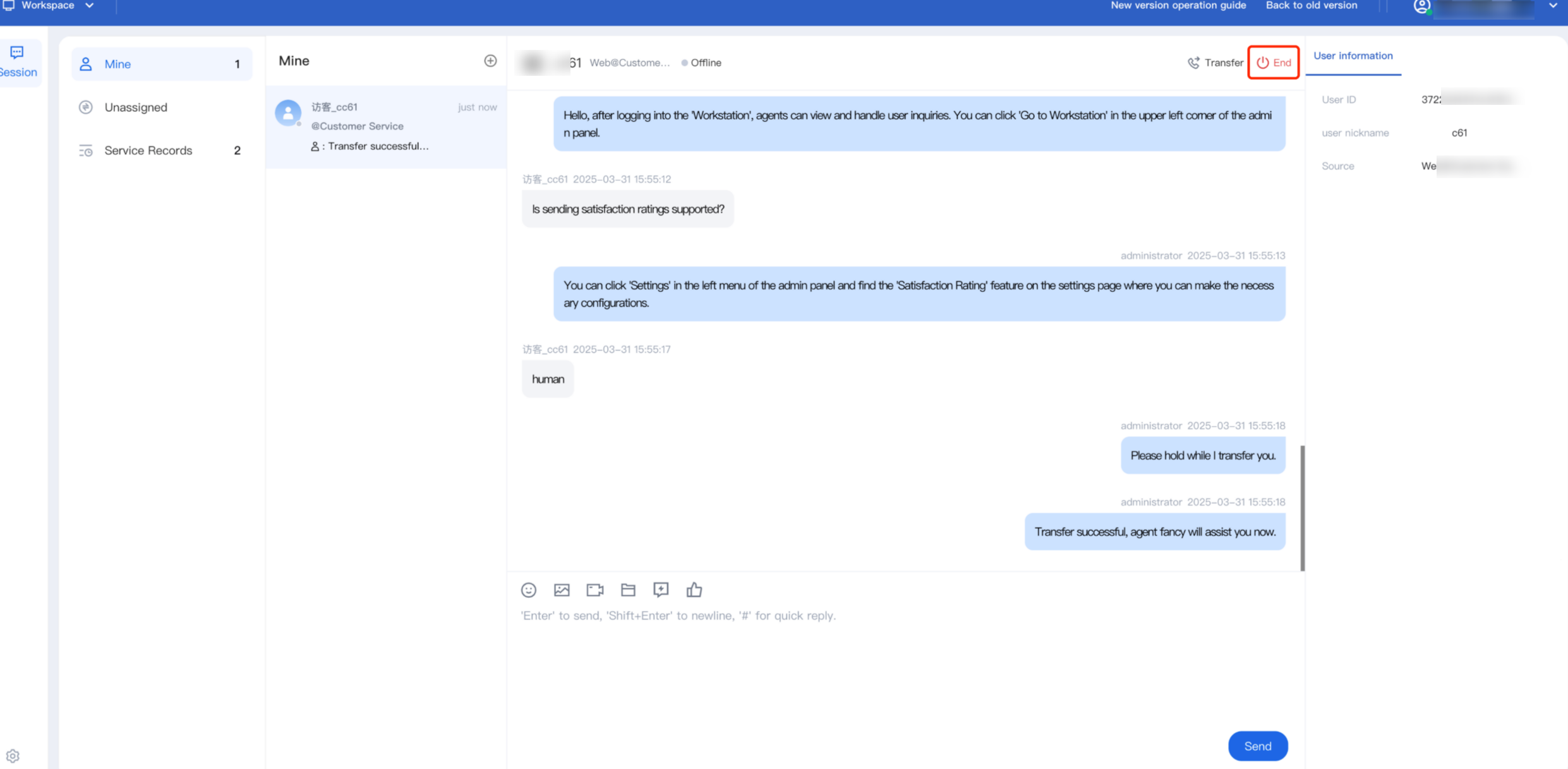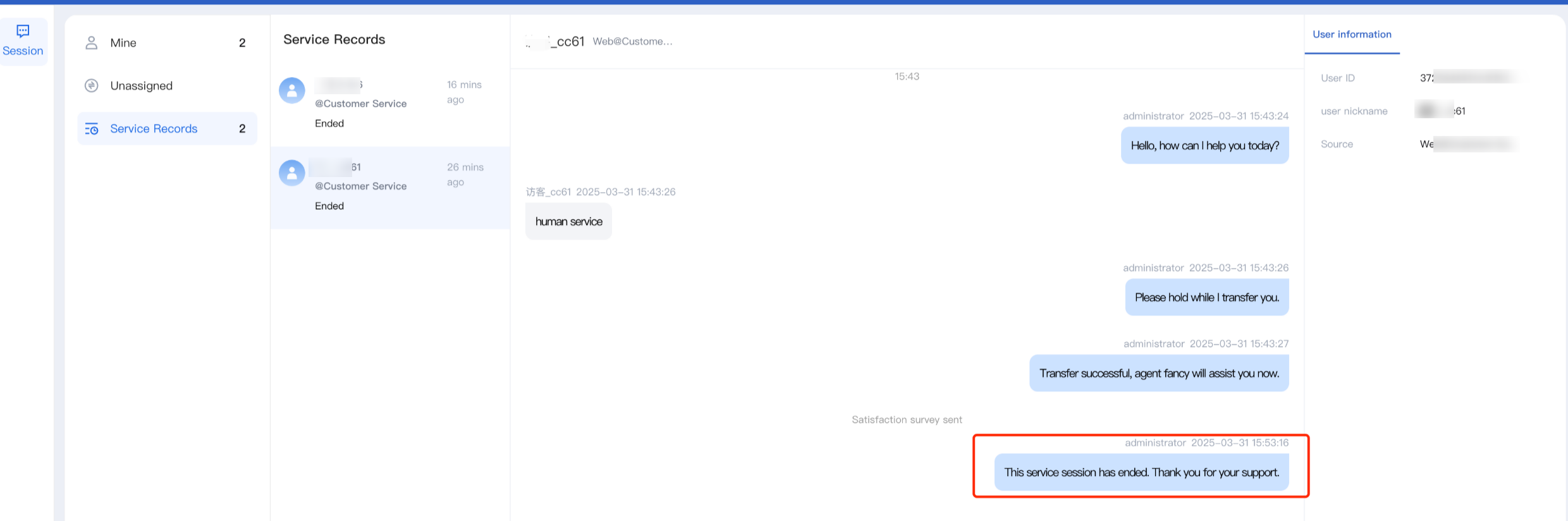 If an agent sends a message and the user fails to reply within the administrator-defined timeout period, the system will automatically end the session. This timeout process requires no manual action from the agent. The system will automatically terminate the session and send an overtime end reminder notification to the user.