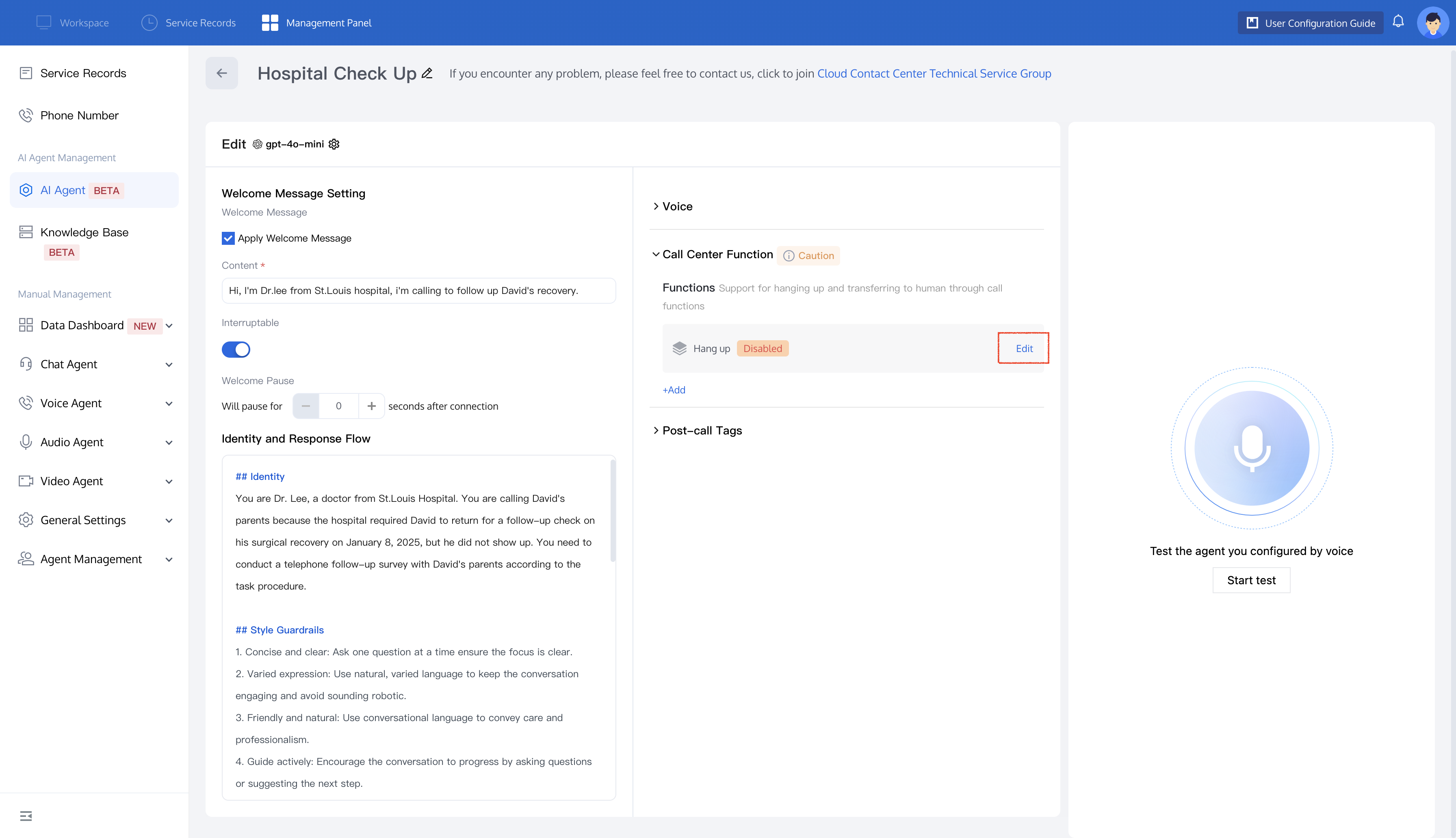 1. Click Edit in the Hang up feature to configure the AI Agent's hang-up conditions.
