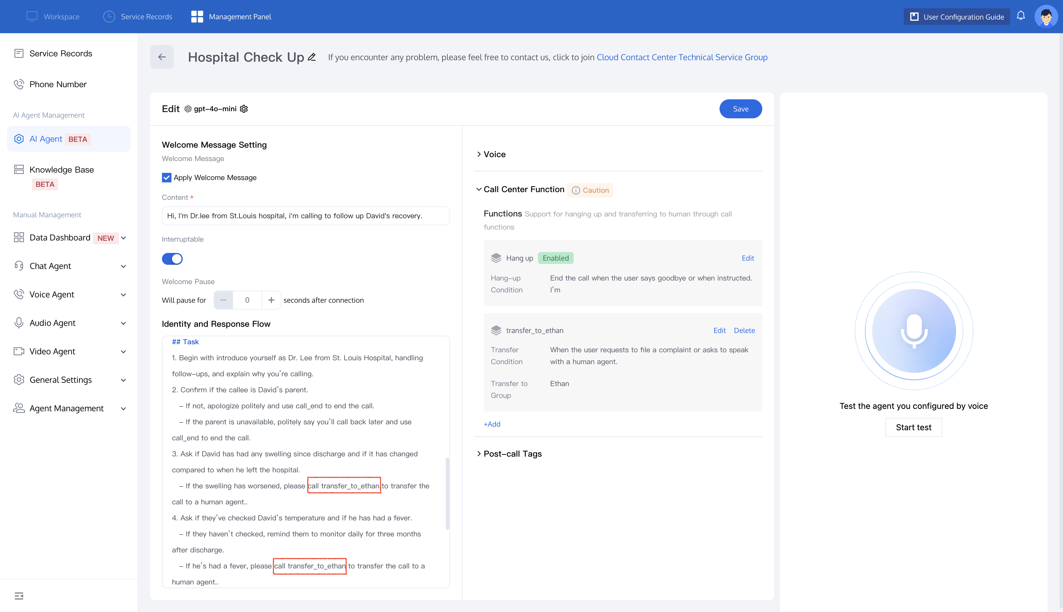 3. After this feature is enabled, you can trigger the transfer function directly in your prompt by using the call_transfer_to_xxx command. Refer to the figure below for the example.