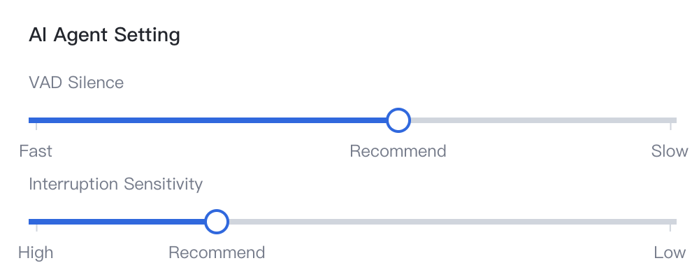 Adjust the interruption sensitivity to control how easily the AI is interrupted. The recommended setting is 500 milliseconds. Higher sensitivity will increase the likelihood for the AI to be interrupted.