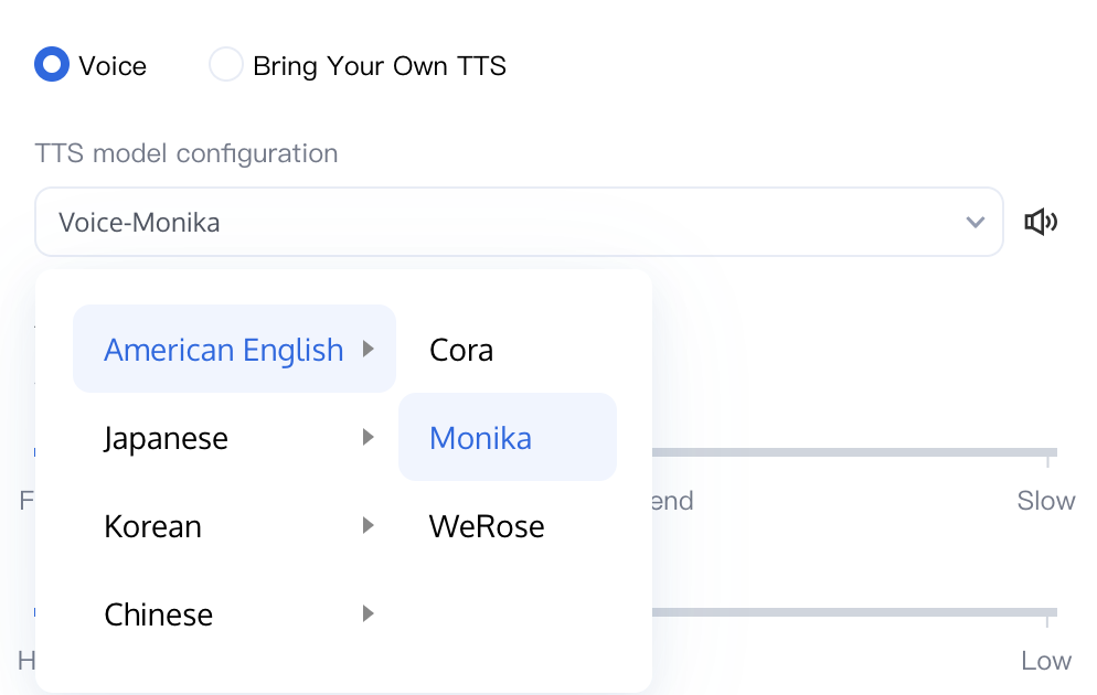 Voice: You can choose different TTS model configuration (e.g.,Monika) to fit different scenario.
