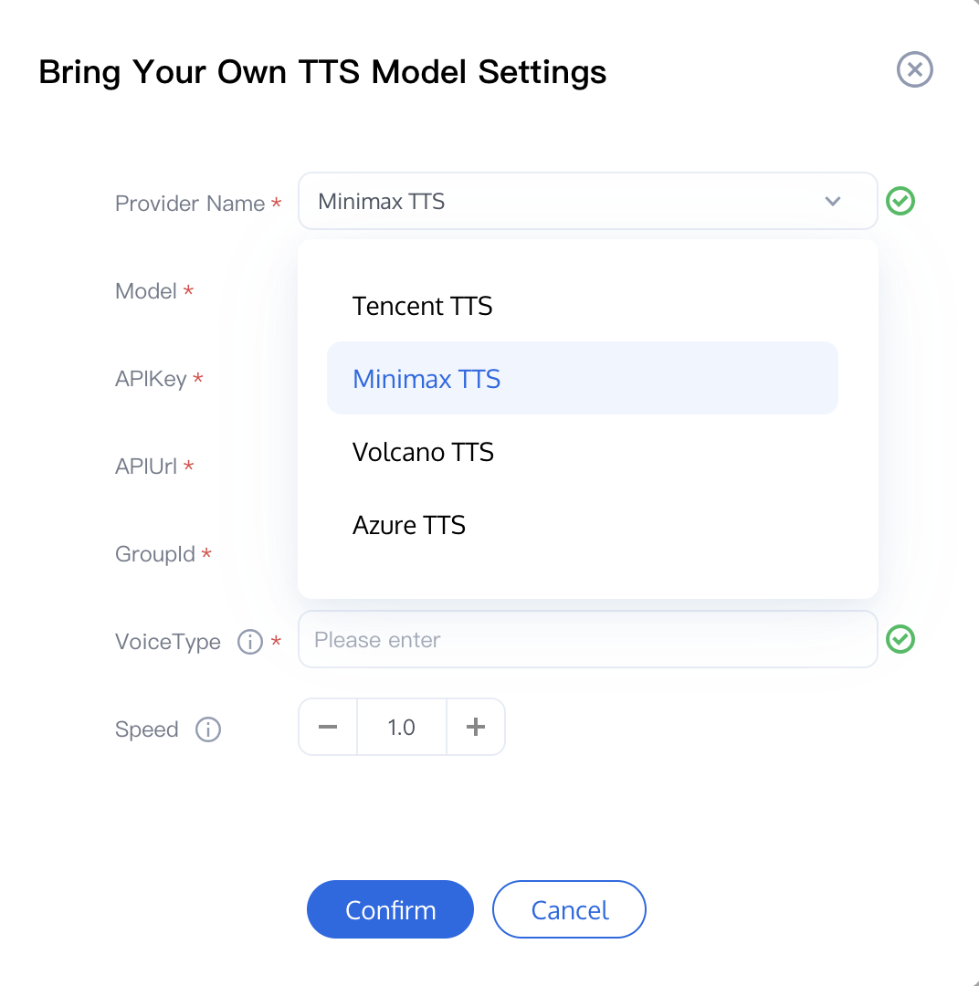 Custom TTS: You can choose from different mainstream Provider Names.