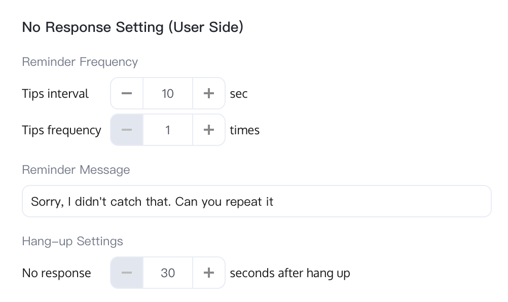 If the user does not respond within the specified time, the AI Agent will automatically hang up the call. The default time is 30 seconds.