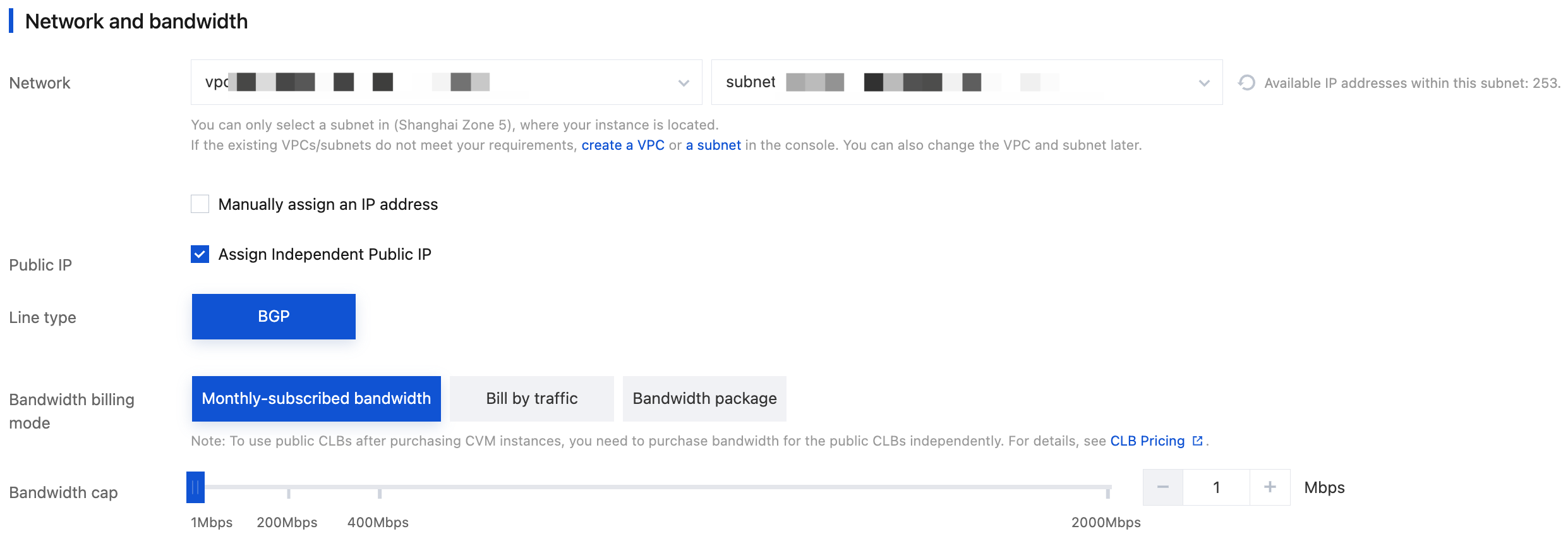 Bandwidth cap: The public network bandwidth cap of the instance. Configure as needed.