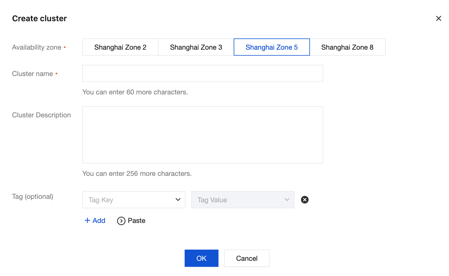 1. Log in to the CVM console, and choose HPC Cluster > Cluster Resources in the left sidebar. 2. On the HPC Cluster page, select the target region at the top and click Create. This article takes Shanghai as an example. For available regions of GPU type HCCPNV5v instances, see Available Regions. 3. In the Create Cluster window, configure AZ, Cluster Name, Cluster Description, and Tags as needed, as shown in the following figure: