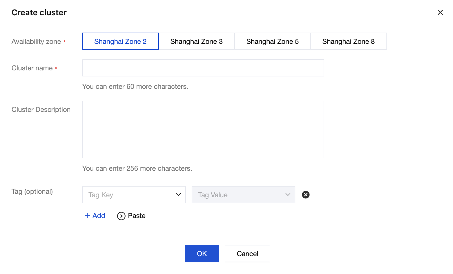 3. In the Create cluster window, configure the Availability zone, Cluster name, Cluster description, and Tag as needed. 4. After confirming that the information is correct, click OK and wait for the cluster creation to complete.