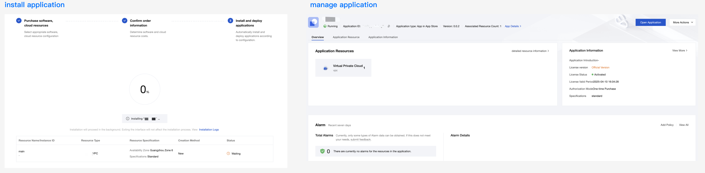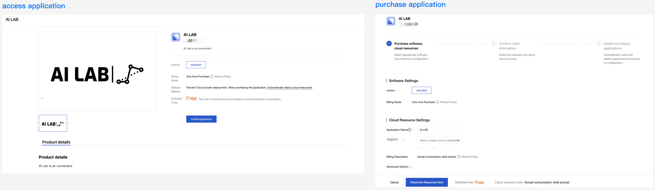 Access Application: Enter the application details page of the order to be placed. After confirming the specifications of software and cloud resources, you can immediately see the accurate price information, then place an order and pay, and start installation.