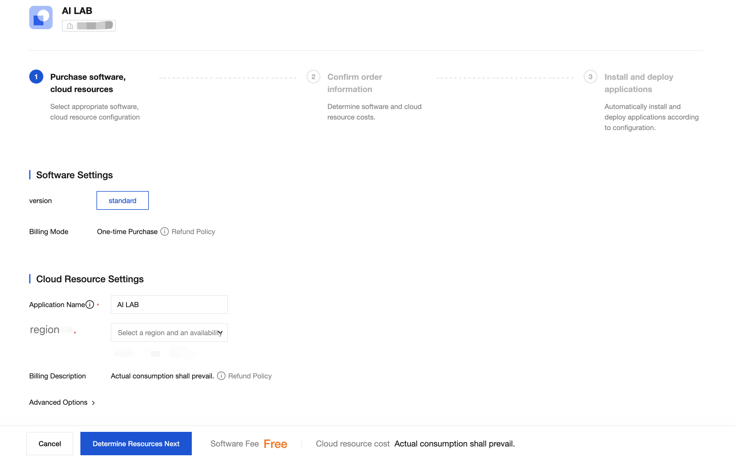 The application includes two parts: software and cloud resources. The software and cloud resources need to be purchased separately. First, purchase and pay for the software, then install the application. The cost of cloud resources will be automatically deducted during installation.