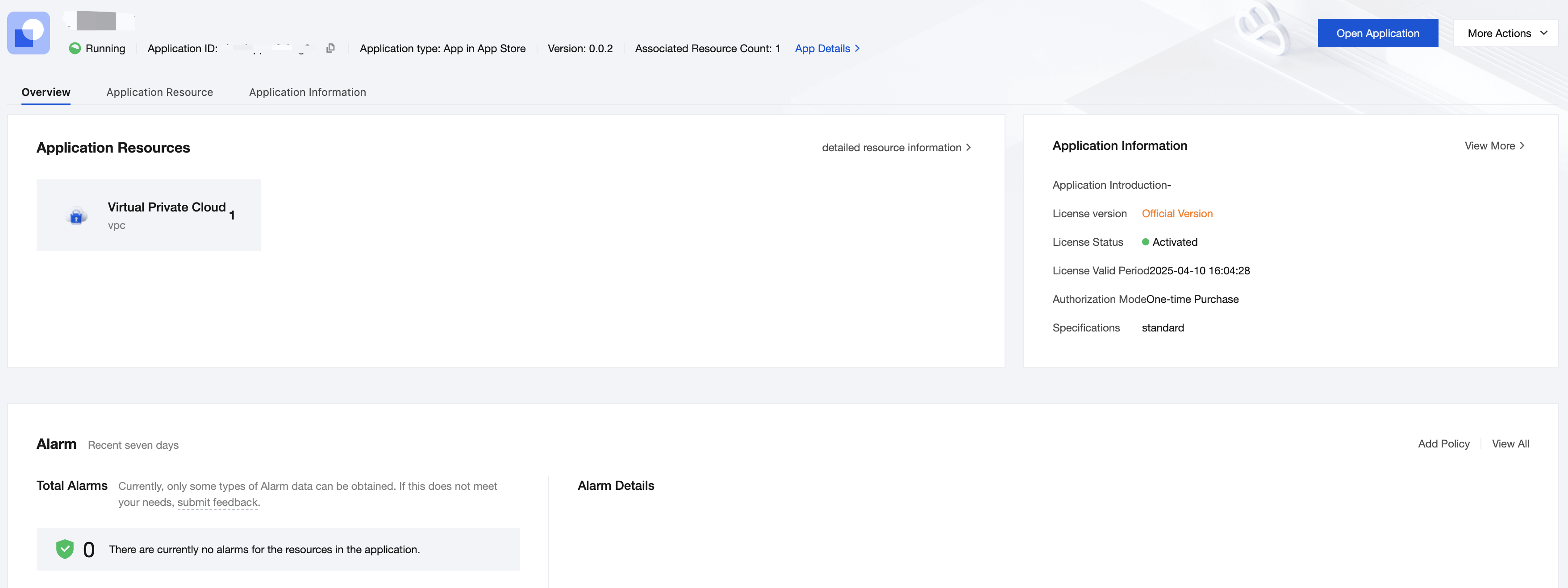 Once installed successfully, the application dashboard will be automatically displayed, and the application purchase will be completed.
