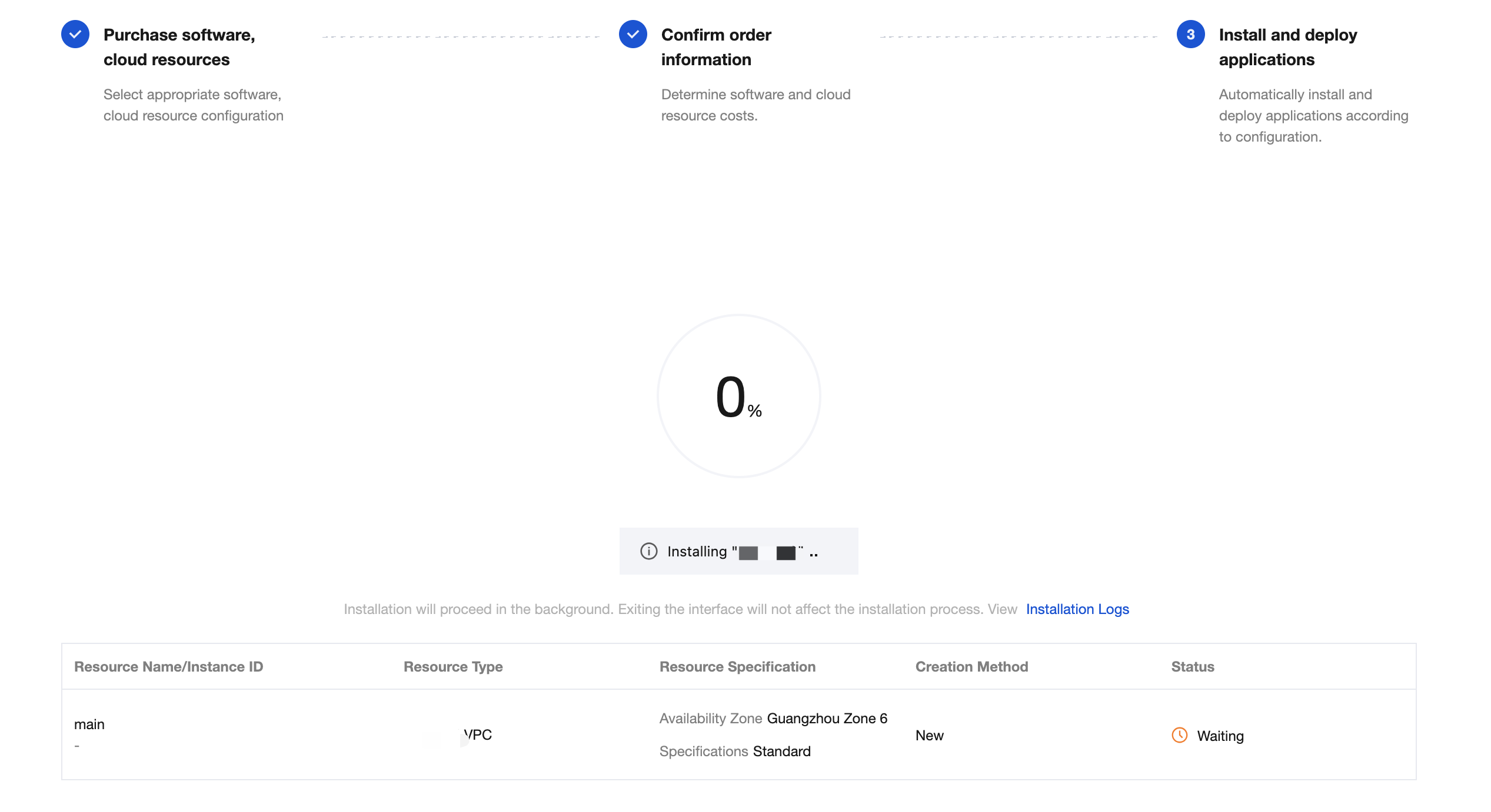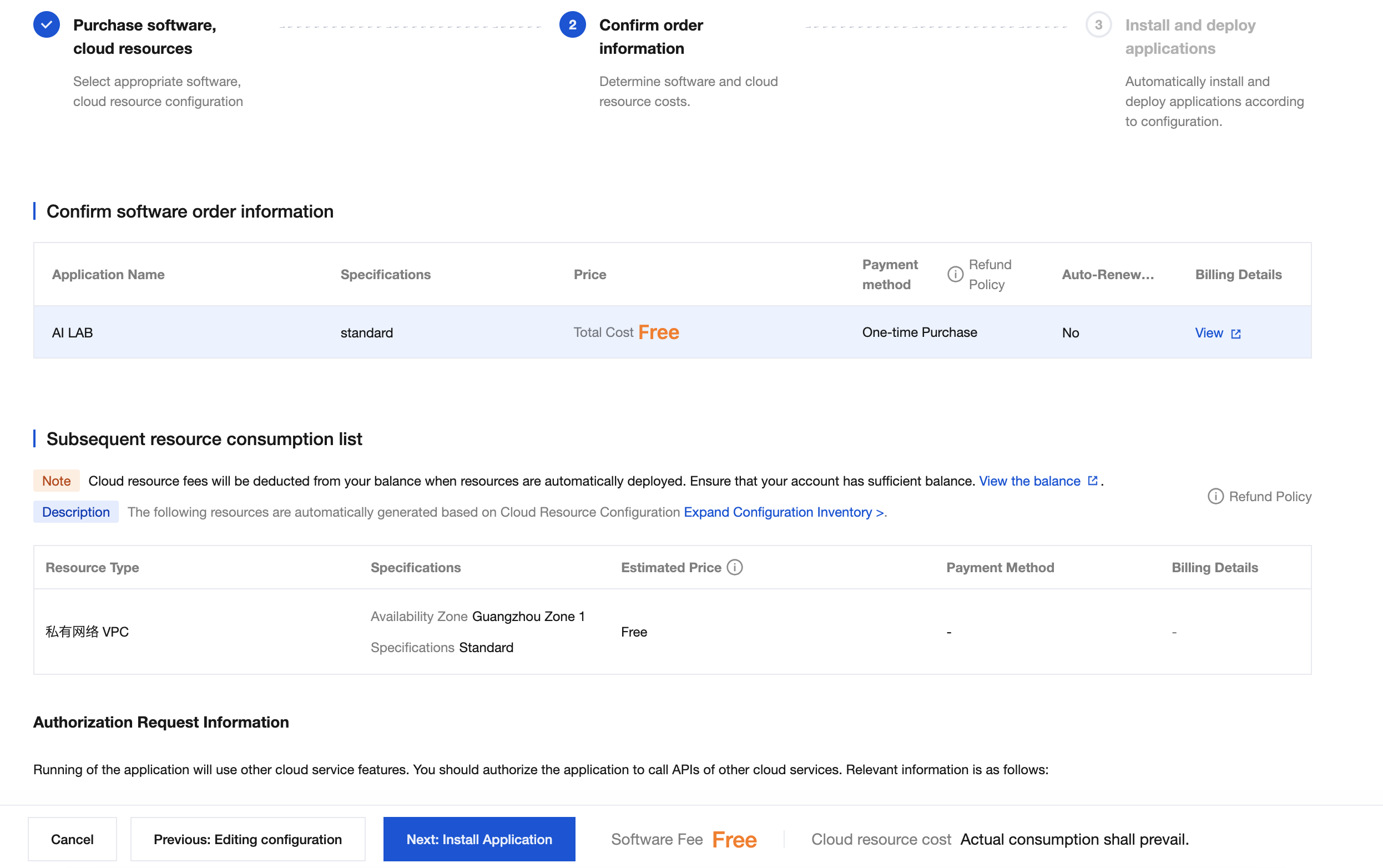 During installation, the cloud resources required by the software dependency will be automatically ordered and the fees will be deducted from your balance.