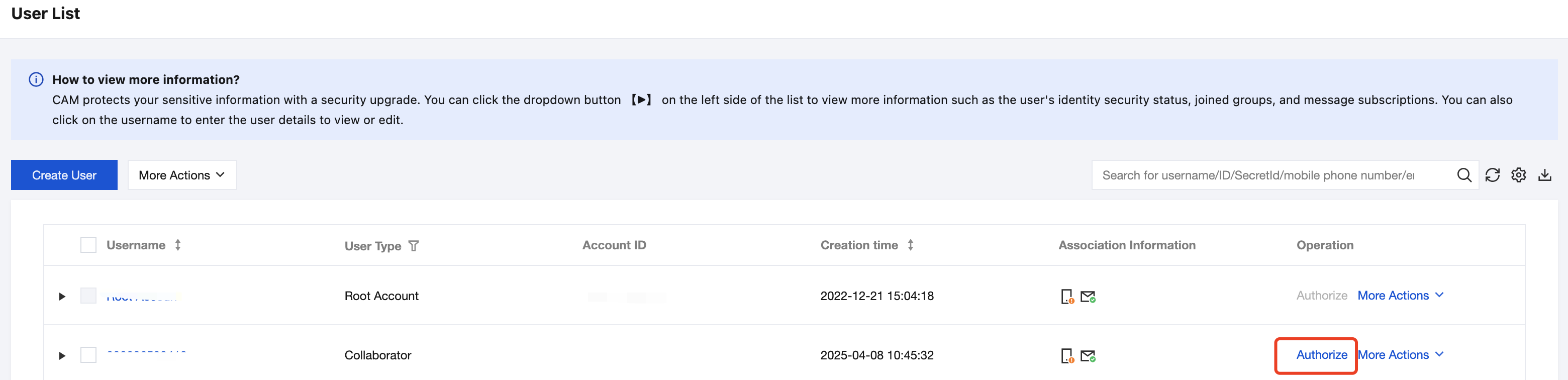 1. Log in to the Tencent Cloud console using the root account, click on the avatar in the upper right corner, and then select CAM. 2. Select Users > User List, find in the list the Sub-user requiring installation permission, and click Authorize.