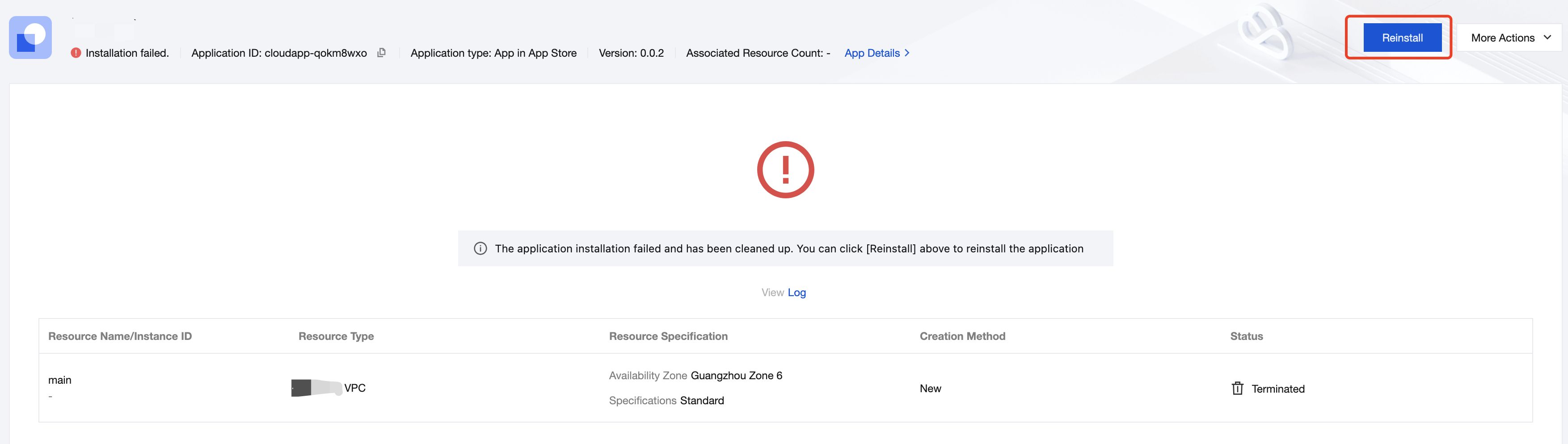 The application may fail to install during the installation process due to insufficient Tencent Cloud account balance, network issue, etc.