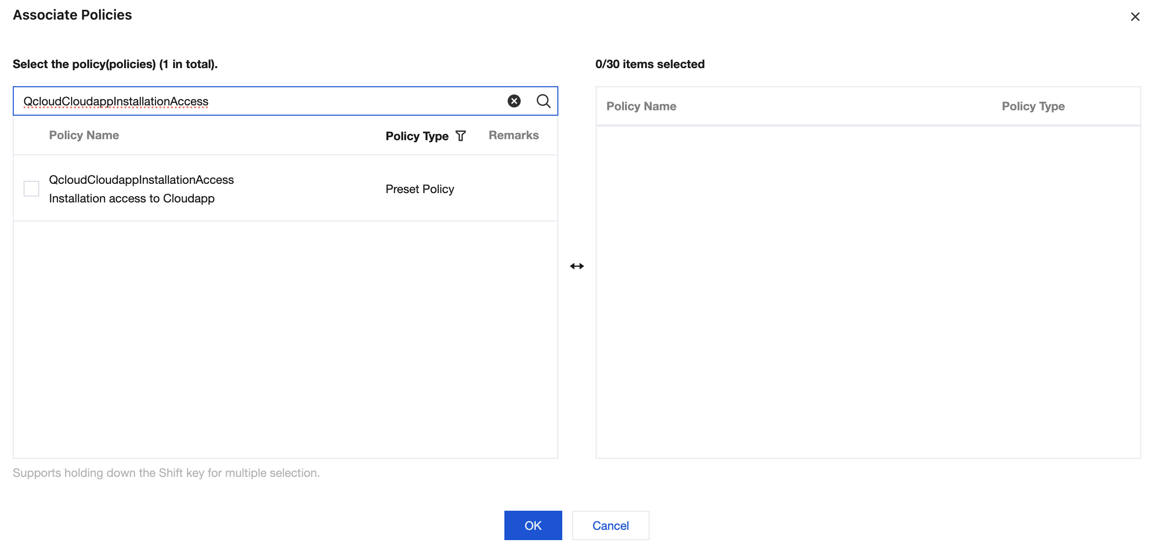 3. Search for "Cloud App" in the associated policy pop-up window or copy the policy name "QcloudCloudappInstallationAccess" to perform search, select the policy and assign it to the Sub-user.