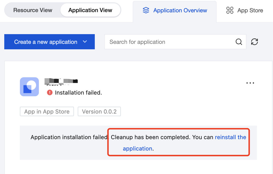 You can retry the installation process through the card prompt in the application overview or the Reinstall button in the upper-right corner of the application details page.