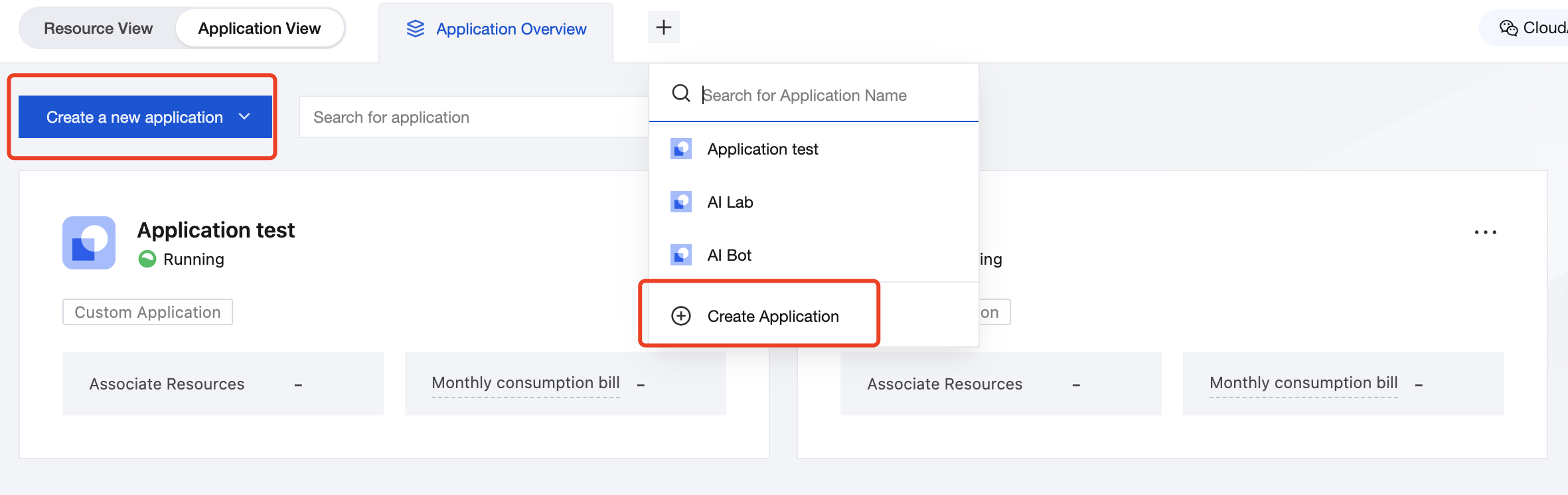 1. Click Application View in the top left corner of the Tencent Cloud Console page to enter the Application Overview page. 2. You can click Create a New Application in the upper left corner, or click the "+" sign next to the page navigation and choose Create Application to enter the page for creating a new application.
