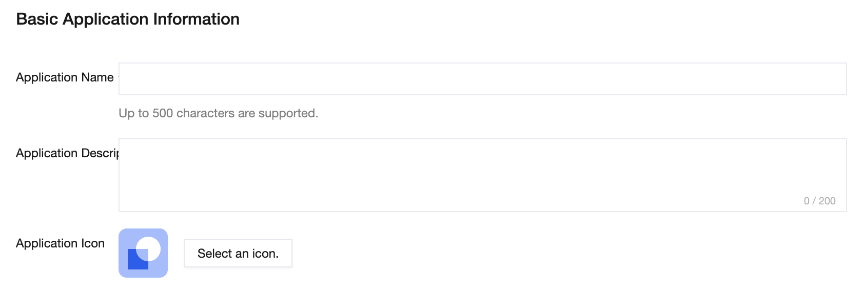 Application icon: optional, select an icon provided by the system or custom upload an icon.