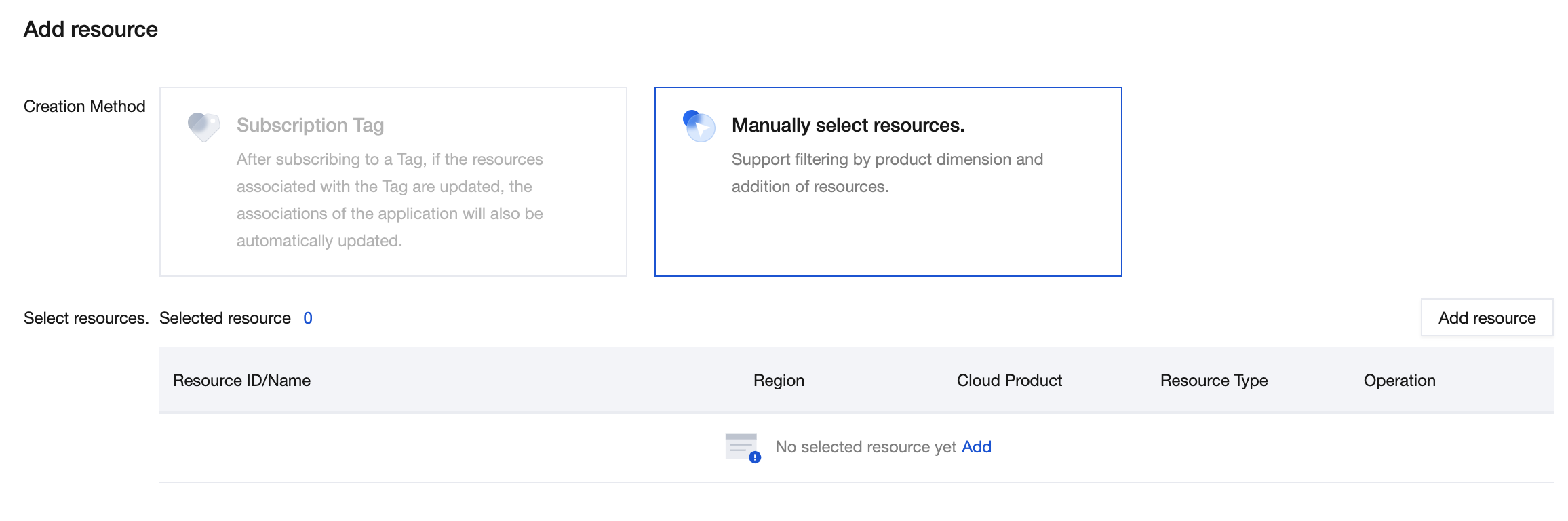1. Select Manually Select Resources. You can directly add resources to the application by manually selecting resources.