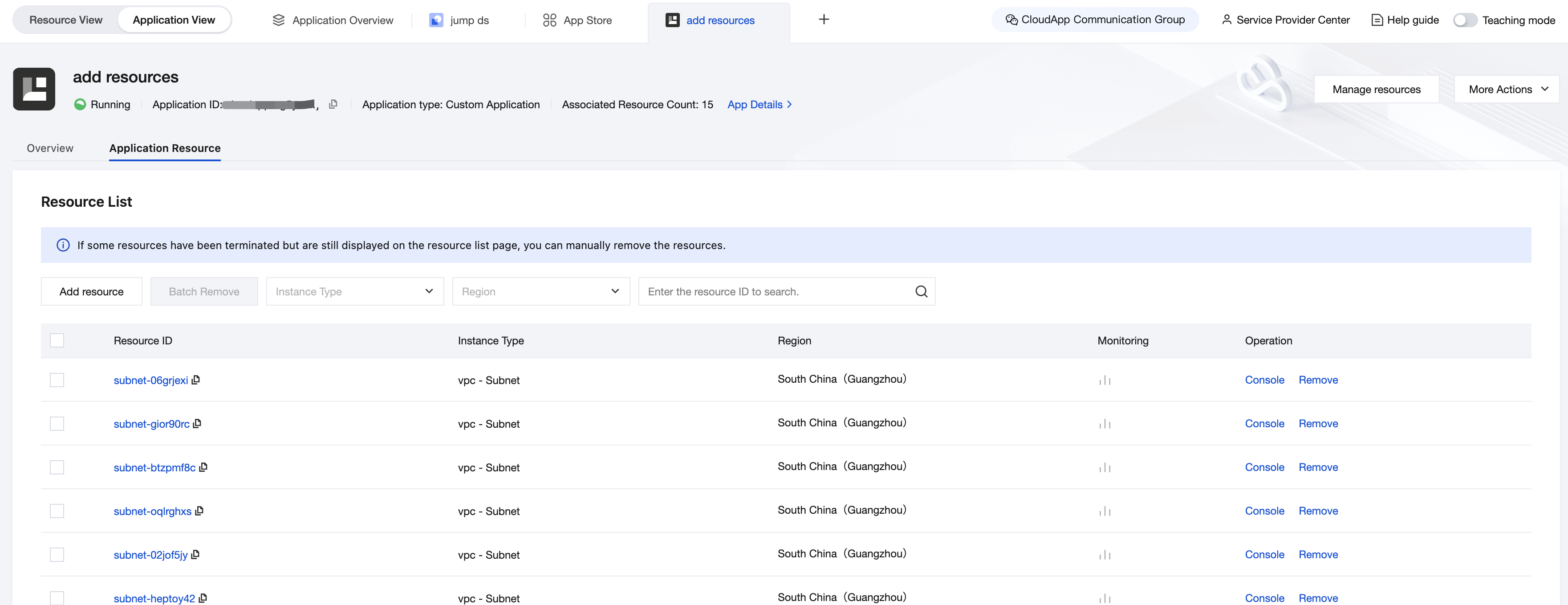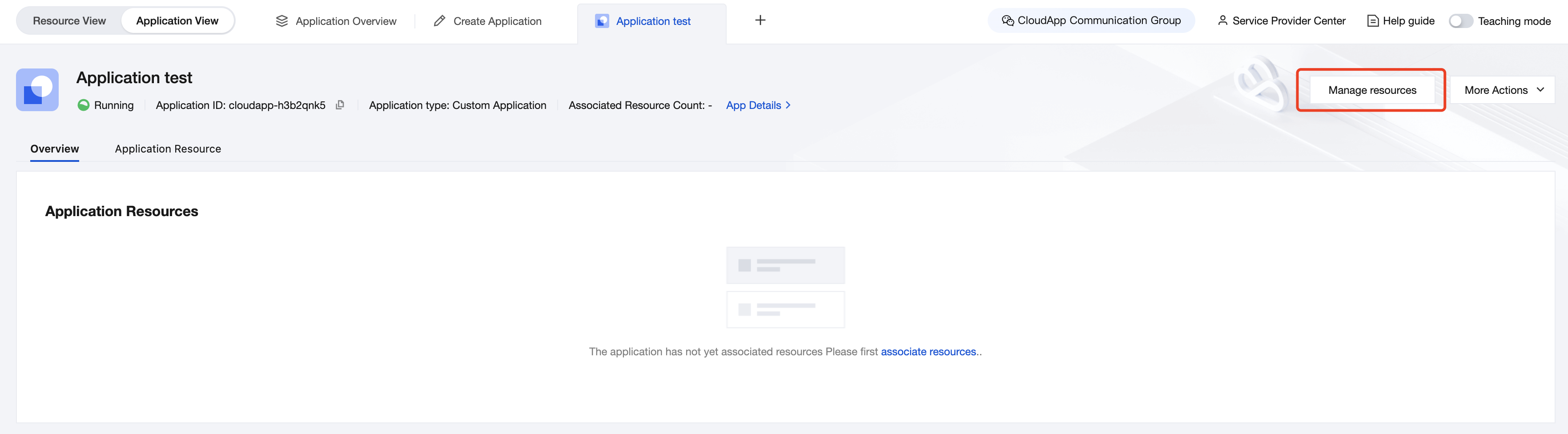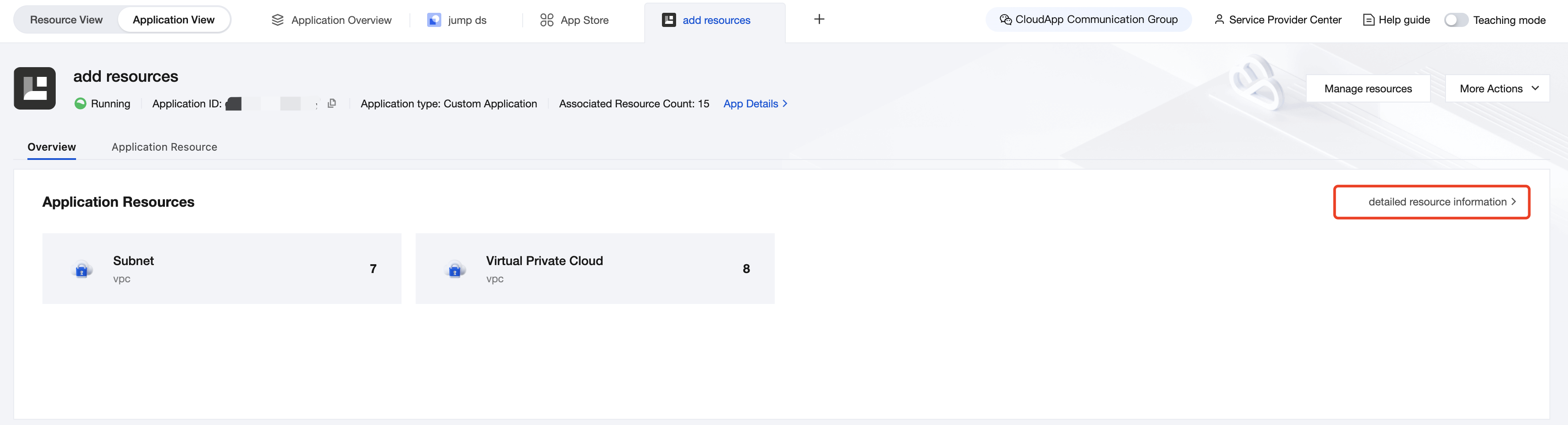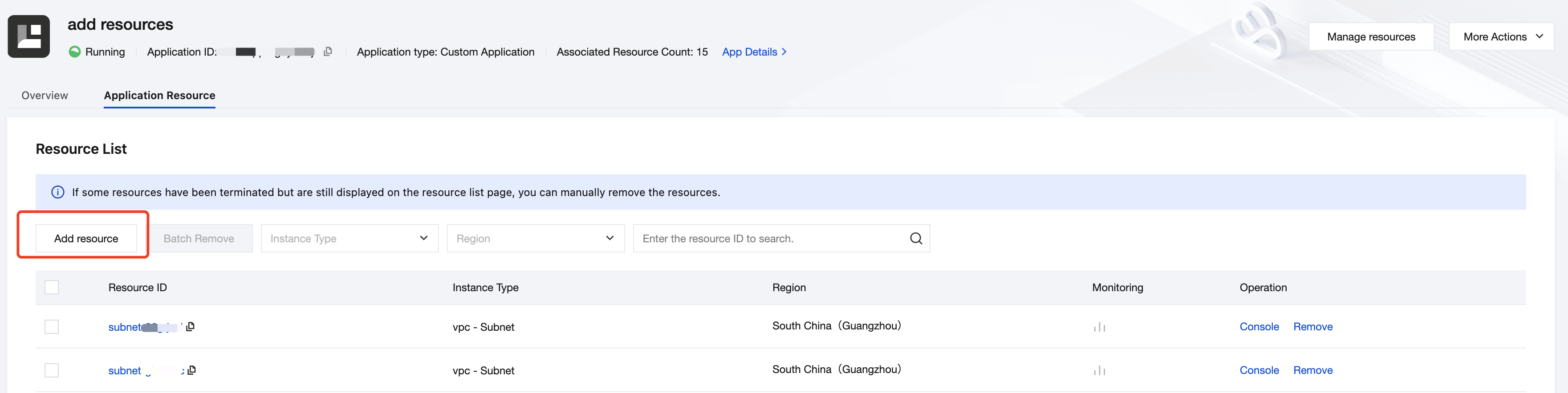 Click Manage Resources in the upper right corner of the application details page, and switch to the list of resources.