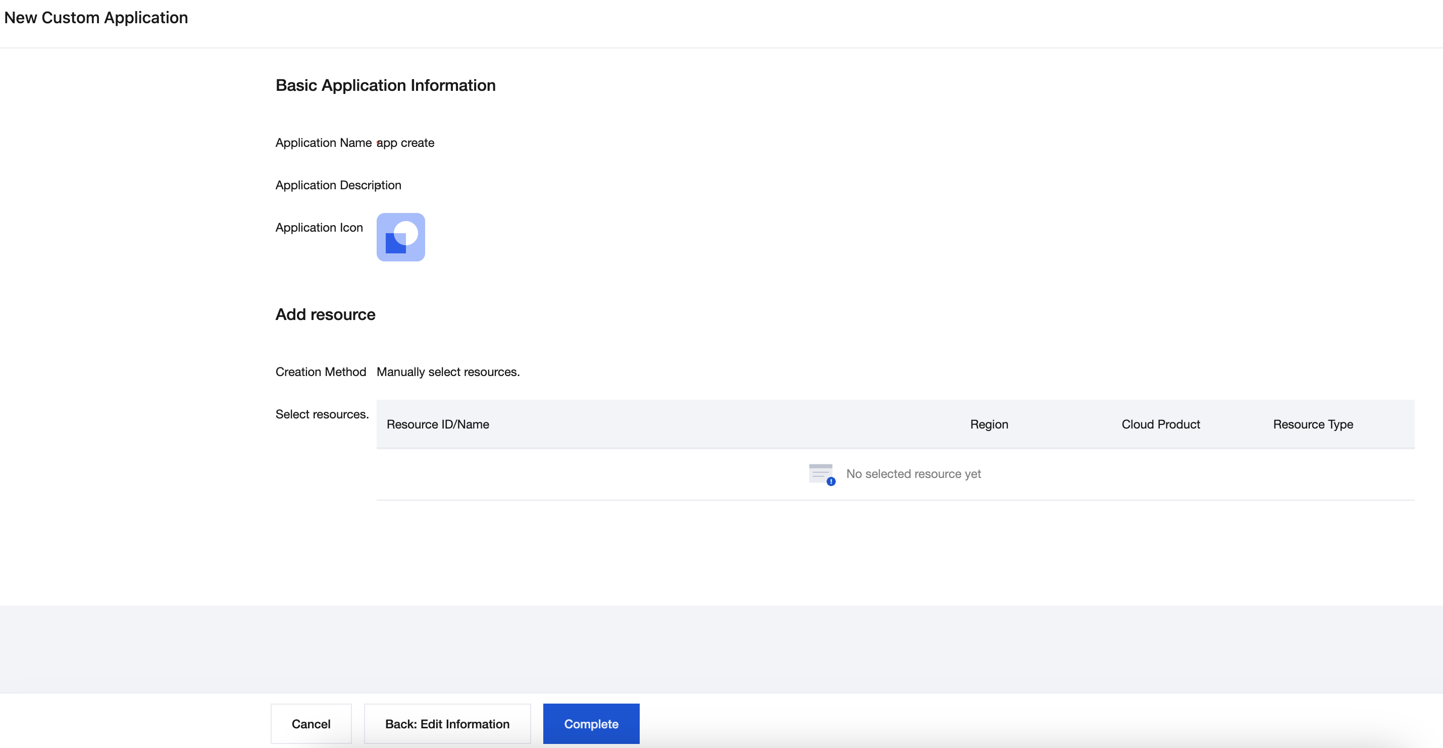 3. On the Create Application page, you need to fill in basic information and add resources for the application.