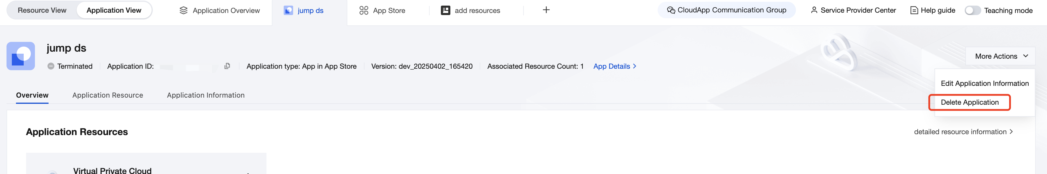 Click Delete Application in the upper-right corner of the application details page to enter the delete application page.