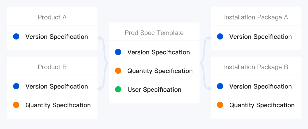 The relationship between the product specification template, product, and installation package is as follows: