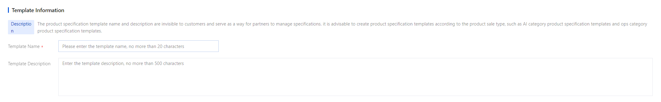 Template description: Must not exceed 500 characters; supports Chinese/English characters, numbers, and special characters. The template description is not visible to customers.