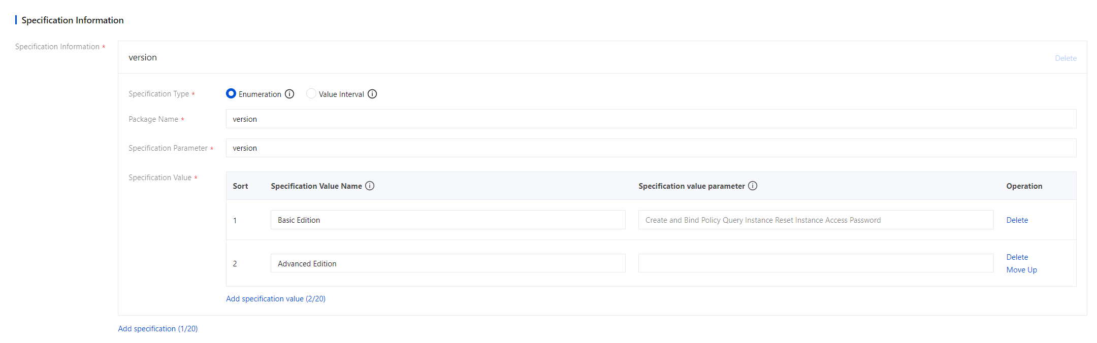 enum | Refers to specifications that are finite and quantifiable, suitable for scenarios with limited specification values. For example: product editions such as Basic Edition, Advanced Edition, and Premium Edition. | For example: the specification is "Edition", and the specification values are "Basic Edition", "Advanced Edition". | |