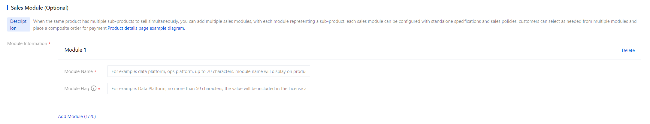 Sales Module | A standalone purchasable module (or sub-product) derived from the same product, typically representing "feature groups" or "service components" that constitute the complete product. Sales Module needs to be associated with products. | - |
