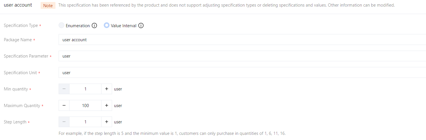 numeric range type | Refers to specifications with a large range that cannot be exhaustively enumerated, suitable for unquantifiable specification values. For example: number of users ranging from 1 to 100. | Partners need to fill in the minimum value, maximum value, and step size. Integers within the range of 1 to 999,999 are supported. Step size refers to the spacing between purchasable quantities. For example: if the minimum quantity is 1 and the step size is 5, customers can only purchase quantities such as 1, 6, 11, and so on. | The customer can enter the quantity to purchase. |