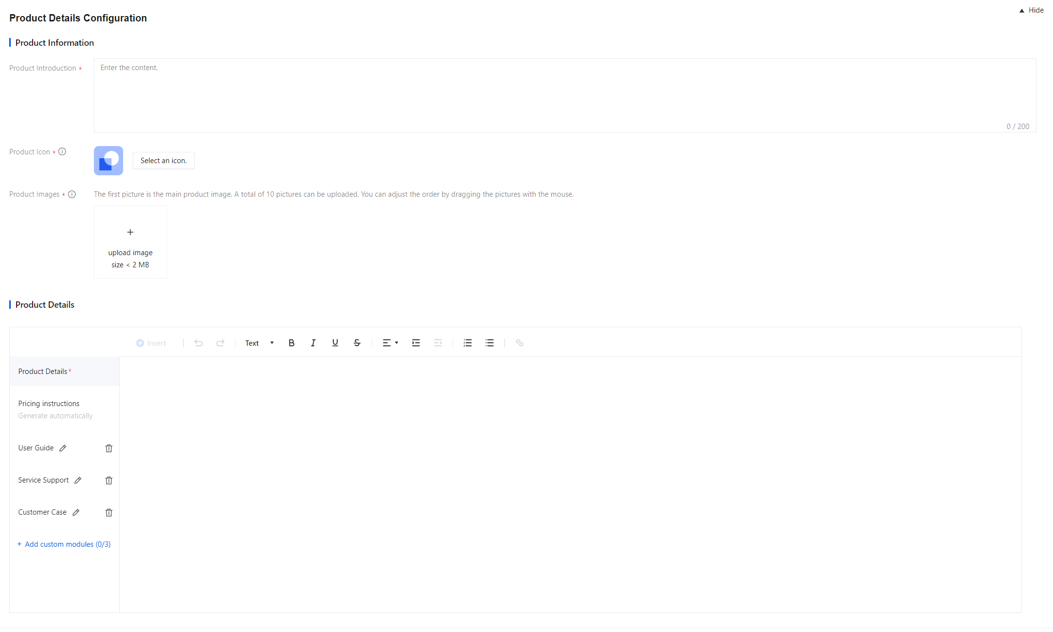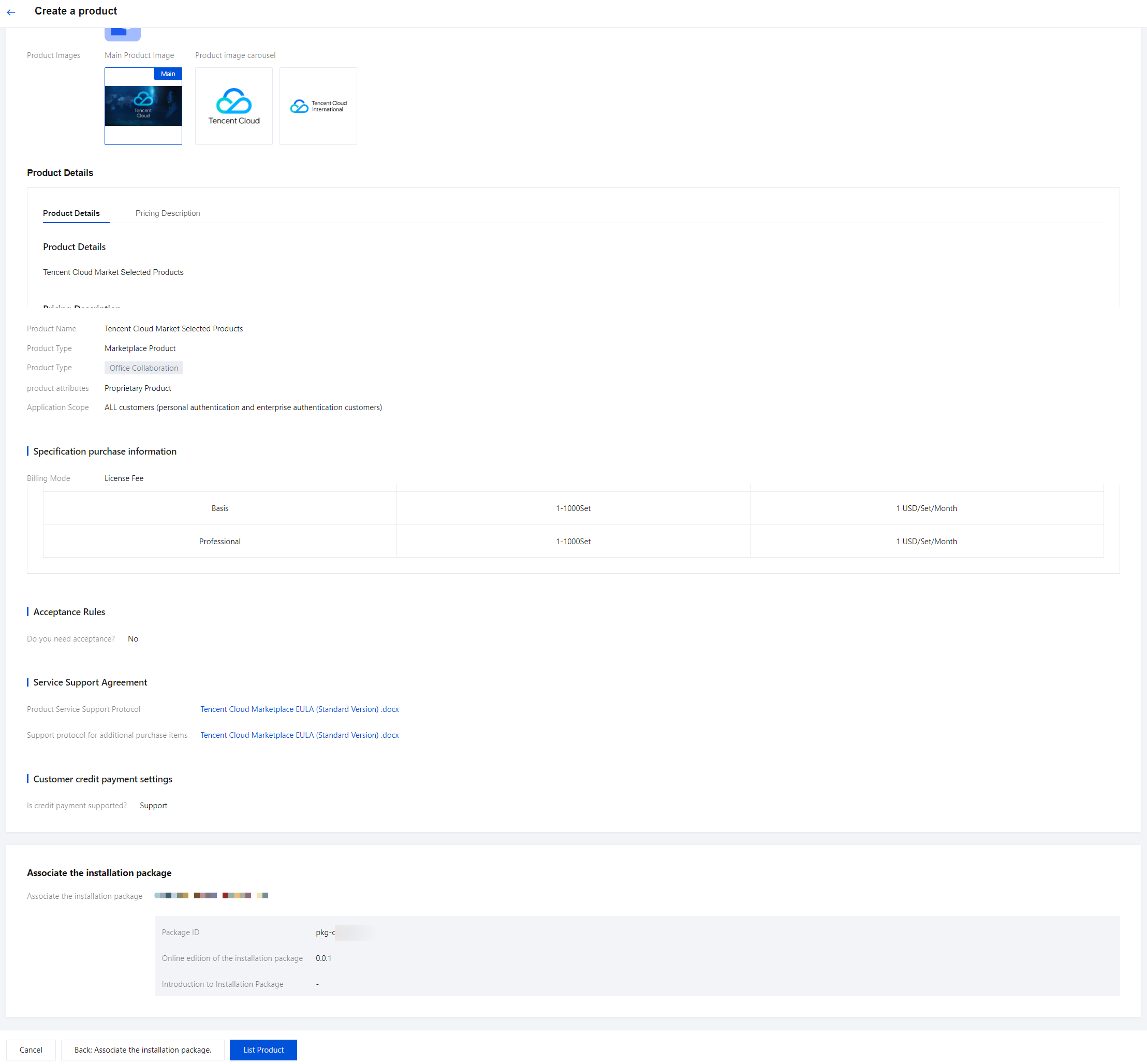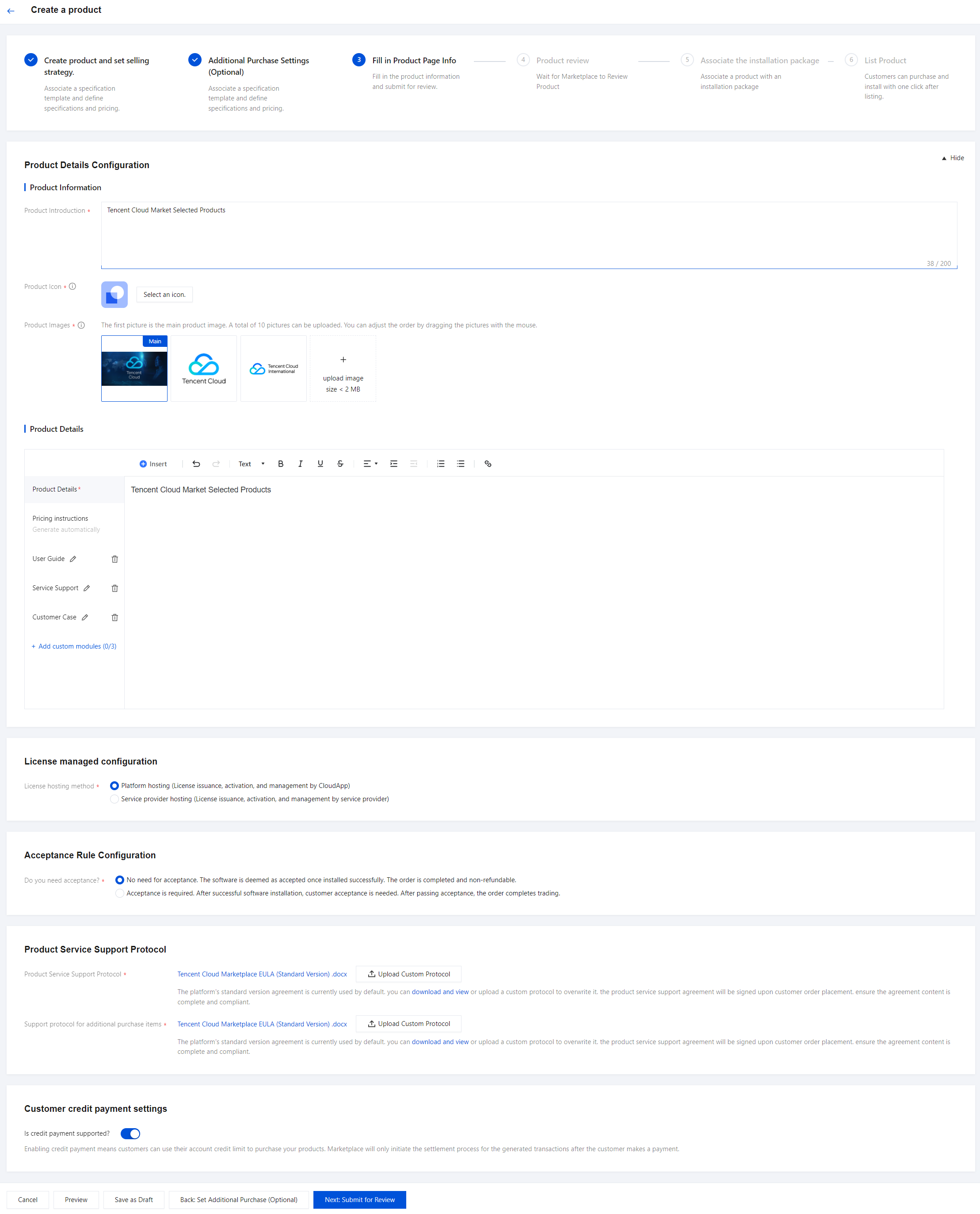 Step 3: Complete the product page information. | Fill in product marketing materials, including: product introduction; product images; product icons; product details; product agreement. | |